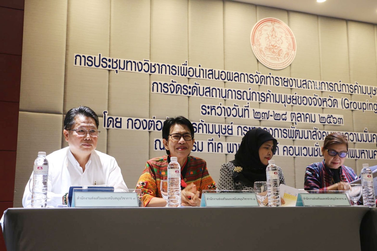 เมื่อวันที่ ๒๘ ตุลาคม ๒๕๖๓ กระทรวงการพัฒนาสังคมและความมั่นคงของมนุษย์ (พม.) จัดการประชุมเชิงวิชาการเพื่อนำเสนอผลการจัดทำรายงานสถานการณ์การค้ามนุษย์รายภูมิภาคและการจัดระดับสถานการณ์การค้ามนุษย์ของจังหวัด โดยมี นายธนสุนทร สว่างสาลี ผู้ตรวจราชการกระทรวงการพัฒนาสังคมและความมั่นคงของมนุษย์ เป็นประธาน โดยมีผู้บริหารหน่วยงานส่วนกลางและระดับจังหวัดทั่วประเทศเข้าร่วมประชุม จำนวนกว่า ๑๐๐ คน ณ โรงแรม ทีเค พาเลซ แอนด์ คอนเวนชั่น กรุงเทพฯ