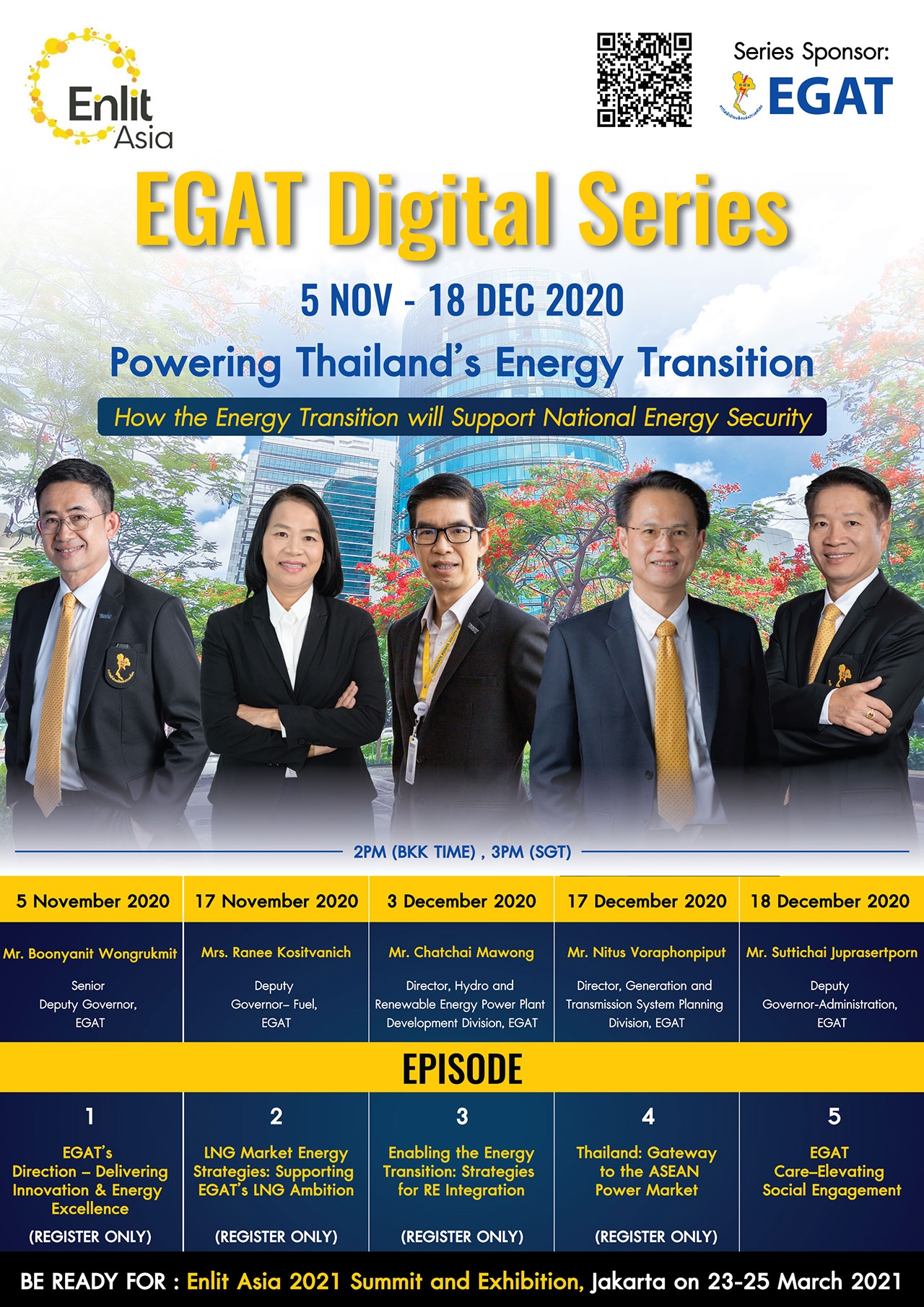กฟผ. ในฐานะหนึ่งในหน่วยงานผู้สนับสนุนจากประเทศไทย ได้เตรียมพร้อมสู่งานดังกล่าวผ่านการจัดสัมมนา Enlit Asia - EGAT Digital Series ในรูปแบบ Online (Webinar) ภายใต้แนวคิด Powering Thailand’s Energy Transition : How the Energy Transition will Support National Energy Security โดยมีผู้บริหารระดับสูงของ กฟผ. เป็นผู้บรรยาย เริ่มตั้งแต่วันที่ 5 พฤศจิกายน 2563 เป็นต้นไป