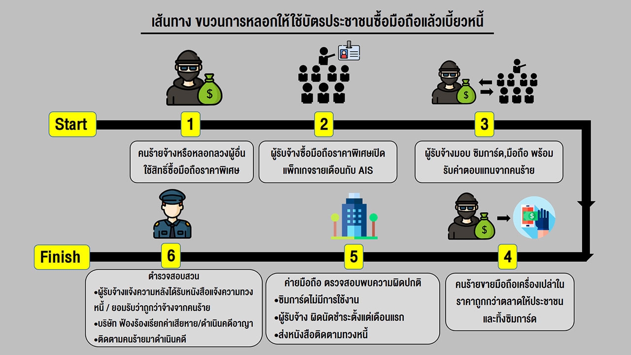 เอไอเอส อาสาออกมาเปิดโปงขบวนการดังกล่าว พร้อมเตือนภัยประชาชนอย่าหลงเชื่อให้ข้อมูลบัตรประชาชนกับบุคคลอื่นเด็ดขาด โดยยกตัวอย่างคดีความที่เกิดขึ้นกับบริษัทที่คนร้ายได้ใช้ความสนิทสนมและอ้างตัวว่าเป็นพนักงานหลอกให้ผู้รับจ้างใช้บัตรประชาชนเพื่อซื้อเครื่องโทรศัพท์ในโปรโมชั่นลดราคาพิเศษที่ประกอบด้วย เครื่องโทรศัพท์มือถือ พร้อมเบอร์ และแพ็กเกจจากเอไอเอส โดยในเงื่อนไขจะต้องเปิดเบอร์และใช้งานกับเครื่องที่ซื้อมา พร้อมชำระเงินต่อเนื่องตามระยะเวลาที่กำหนด แต่กลุ่มผู้รับจ้างเมื่อซื้อเครื่องแล้วกลับนำไปส่งต่อให้คนร้าย โดยคนร้ายให้ค่าตอบแทนสำหรับผู้รับจ้างที่ยอมใช้สิทธิ์และใช้ข้อมูลบัตรประชาชนคนละ 600-1,000 บาท โดยคนร้ายอ้างว่าได้เคลียร์กับเอไอเอสแล้ว จะไม่มีหนังสือติดตามทวงหนี้จากเอไอเอสไปยังผู้รับจ้างอย่างแน่นอน จากนั้นคนร้ายนำเครื่องโทรศัพท์ไปแยกขายให้บุคคลอื่นต่อ ทำให้เบอร์ที่ผู้รับจ้างเปิดไว้ไม่มีการใช้งานจริงตามเงื่อนไขแพ็กเกจที่สมัคร รวมถึงไม่มีการชำระค่าบริการตามสัญญา ซึ่งเป็นการกระทำที่ผิดสัญญาในเงื่อนไขการซื้อ