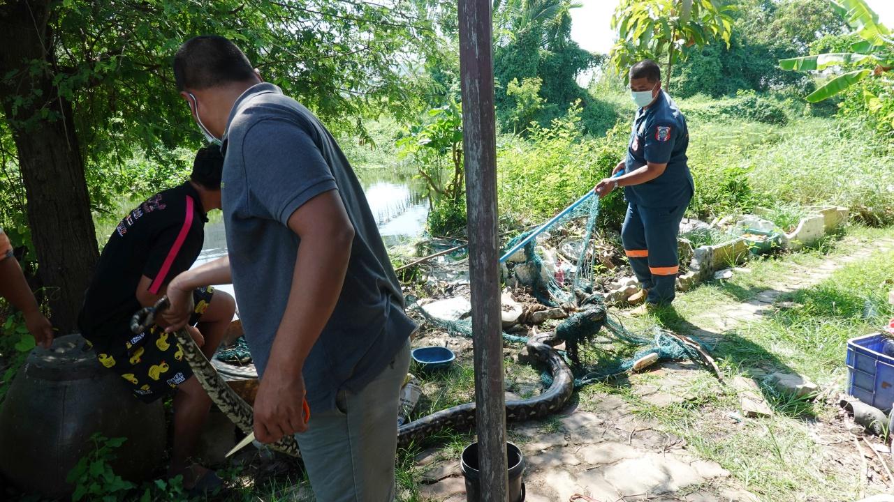 วันที่ 7 ธ.ค. 2563 ผู้สื่อข่าวรายงานว่า หน่วยกู้ภัยเทศบาลตำบลท่าข้าม พร้อมอุปกรณ์จับสัตว์เลื้อยคลาน ตรวจสอบเหตุพบงูเหลือมขนาดใหญ่ติดอวนและกัดคนได้รับบาดเจ็บ ภายในซอย 4/2 ท่าข้าม ม.4 ต.ท่าข้าม อ.บางปะกง จ.ฉะเชิงเทรา เมื่อไปถึงที่เกิดเหตุพบ นายวัฒนา เสนาะล้ำ อายุ 42 ปี ยืนคอยอยู่ โดยพบงูเหลือมขนาดความยาว 4 เมตรกว่า ติดอวนอยู่ โดยทางเจ้าหน้าที่ต้องใช้กรรไกรค่อยๆ ตัดอวนที่ลัดตัวงูเหลือมออก โดยใช้เวลาประมาณ 5 นาที จึงสามารถนำงูเหลือมออกมาใส่ถุงปุ๋ยเพื่อปล่อยคืนธรรมชาติได้สำเร็จ