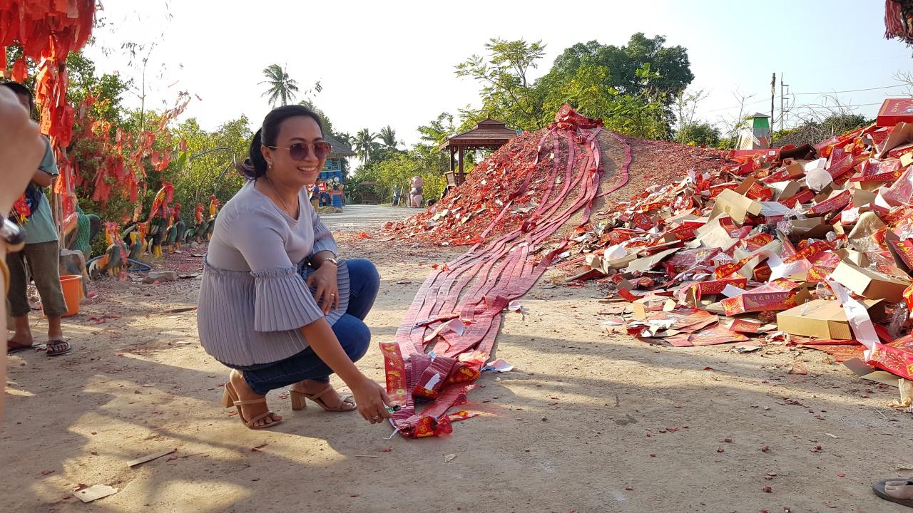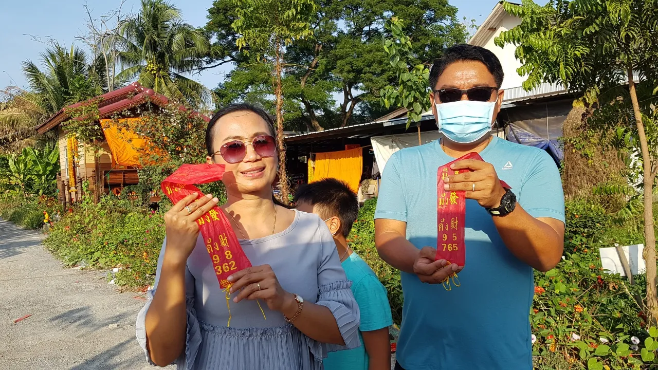 สำหรับหางประทัดที่จุดมานั้น ได้หางประทัดมา 2 ใบ ใบแรก เป็นเลข 98 และ 362 ส่วนใบที่สอง เป็นเลข 95 กับ 765 พร้อมกับนำมาโชว์ให้ดู ก่อนที่จะไปหาซื้อลอตเตอรี่ตามแผงเช่นเคย ในส่วนของหางประทัดนั้นสาธุชนที่มามุงดูประทัดต่างมาขอถ่ายภาพเพื่อนำไปเสี่ยงโชคเช่นกัน.