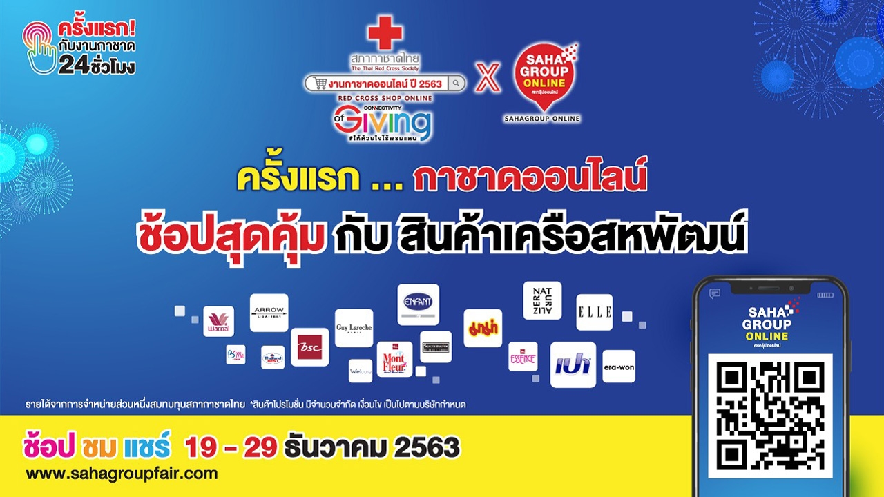 ครั้งแรกของงานกาชาดวิถีใหม่ ในรูปแบบแพลตฟอร์มออนไลน์ www.งานกาชาด.com พร้อมช็อปสินค้ามากมายในเครือสหพัฒน์ รับโปรโมชั่นพิเศษสำหรับงานกาชาดผ่าน www.sahagroupfair.com ระหว่างวันที่ 19-29 ธันวาคม 2563 เท่านั้น