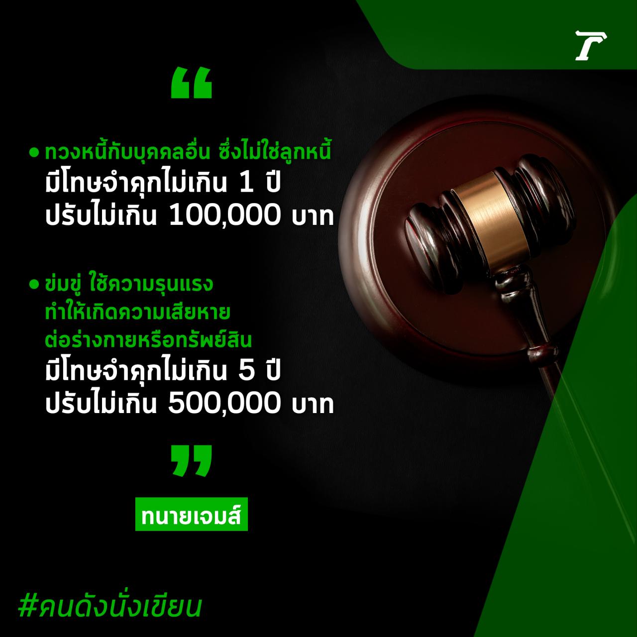 นอกจากนี้ การที่เจ้าหน้าที่ของแอปพลิเคชันให้กู้ยืมเงินโทรศัพท์ไปทวงหนี้กับบุคคลอื่น ซึ่งไม่ใช่ลูกหนี้นั้น มีความผิดตามพระราชบัญญัติการทวงถามหนี้ มาตรา 8 ผู้ฝ่าฝืนมีโทษจำคุกไม่เกิน 1 ปี ปรับไม่เกิน 100,000 บาท และหากมีการทวงถามหนี้ในลักษณะเข้าองค์ประกอบความผิดตามมาตรา 11 เช่น ข่มขู่ ใช้ความรุนแรง ทำให้เกิดความเสียหายต่อร่างกายหรือทรัพย์สิน ผู้ฝ่าฝืนมีโทษจําคุกไม่เกิน 5 ปี หรือปรับไม่เกิน 500,000 บาท หรือทั้งจําทั้งปรับ