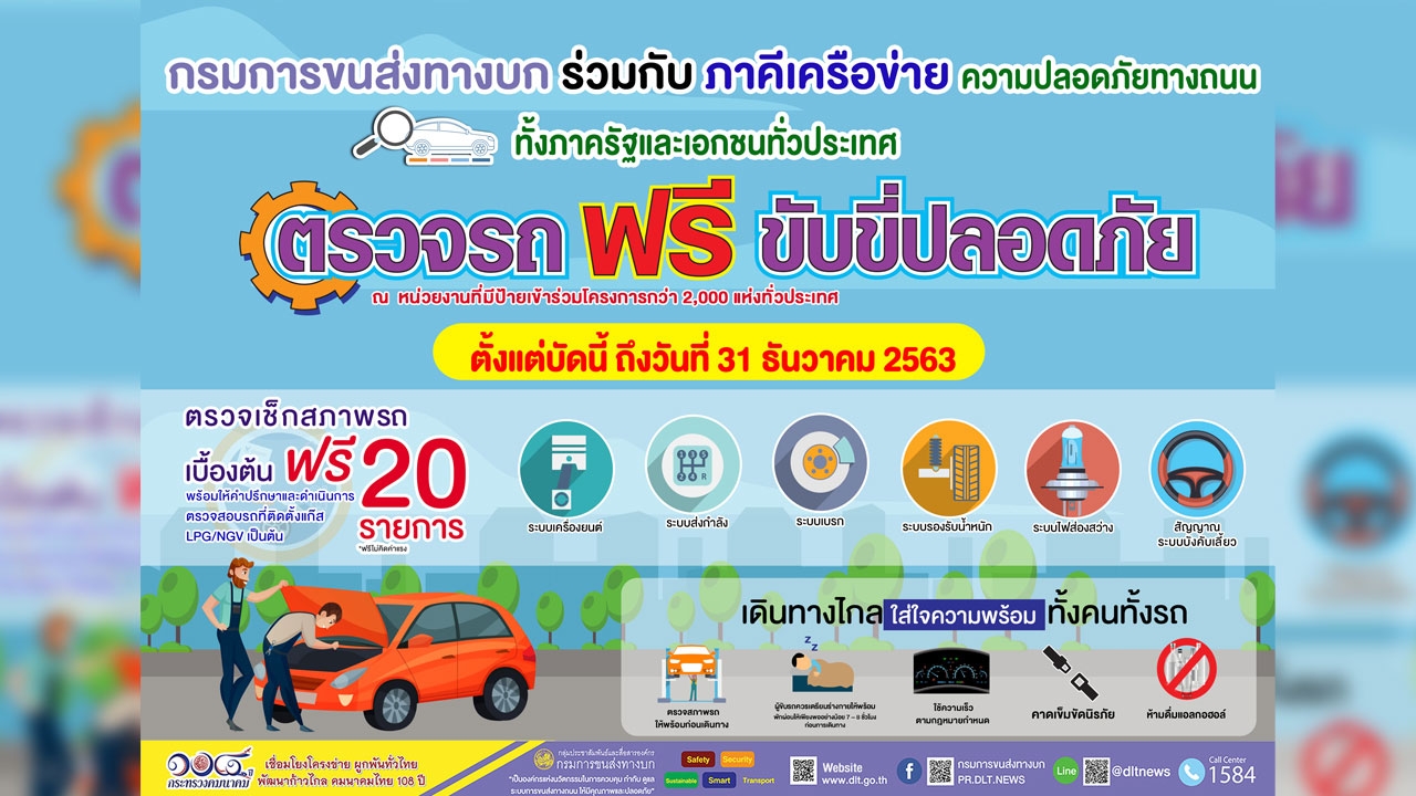 กรมการขนส่งทางบก ร่วมกับ ภาคีเครือข่ายความปลอดภัยทางถนน ทั้งภาครัฐและเอกชนทั่วประเทศ จัดกิจกรรม “ตรวจรถฟรี ขับขี่ปลอดภัย” ให้บริการตรวจเช็กสภาพรถยนต์และรถจักรยานยนต์เบื้องต้นก่อนเดินทาง ฟรี!!! ตลอดเดือนธันวาคม 2563 เชิญชวนผู้ใช้รถใช้ถนนเดินทางวิถีใหม่อย่างปลอดภัย เตรียมความพร้อมของรถก่อนการเดินทางช่วงปีใหม่