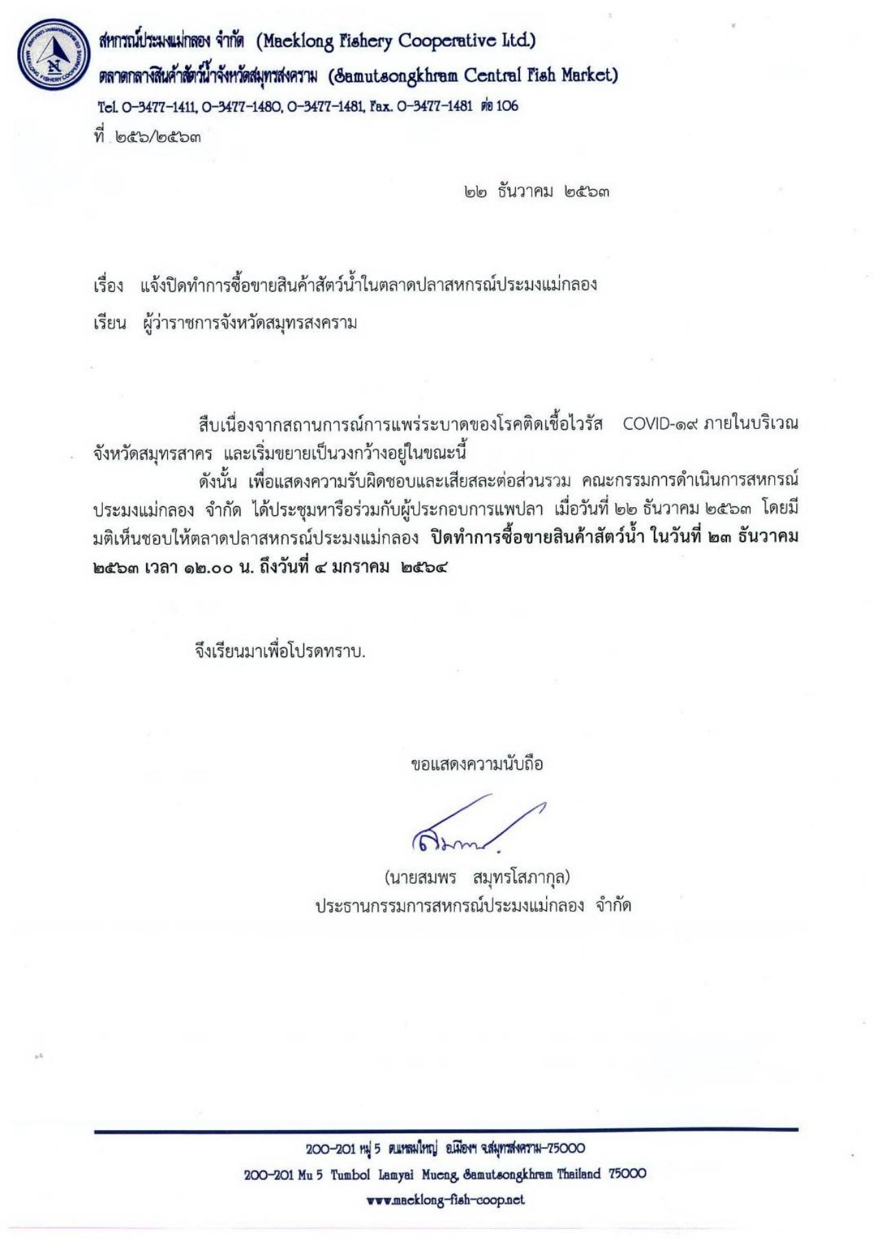 วันที่ 22 ธันวาคม 2563 สหกรณ์ประมงแม่กลอง ตลาดกลางสินค้าสัตว์น้ำจังหวัดสมุทรสงคราม ประกาศเรื่อง แจ้งปิดทำการซื้อขายสินค้าสัตว์น้ำในตลาดปลาสหกรณ์ประมงแม่กลอง