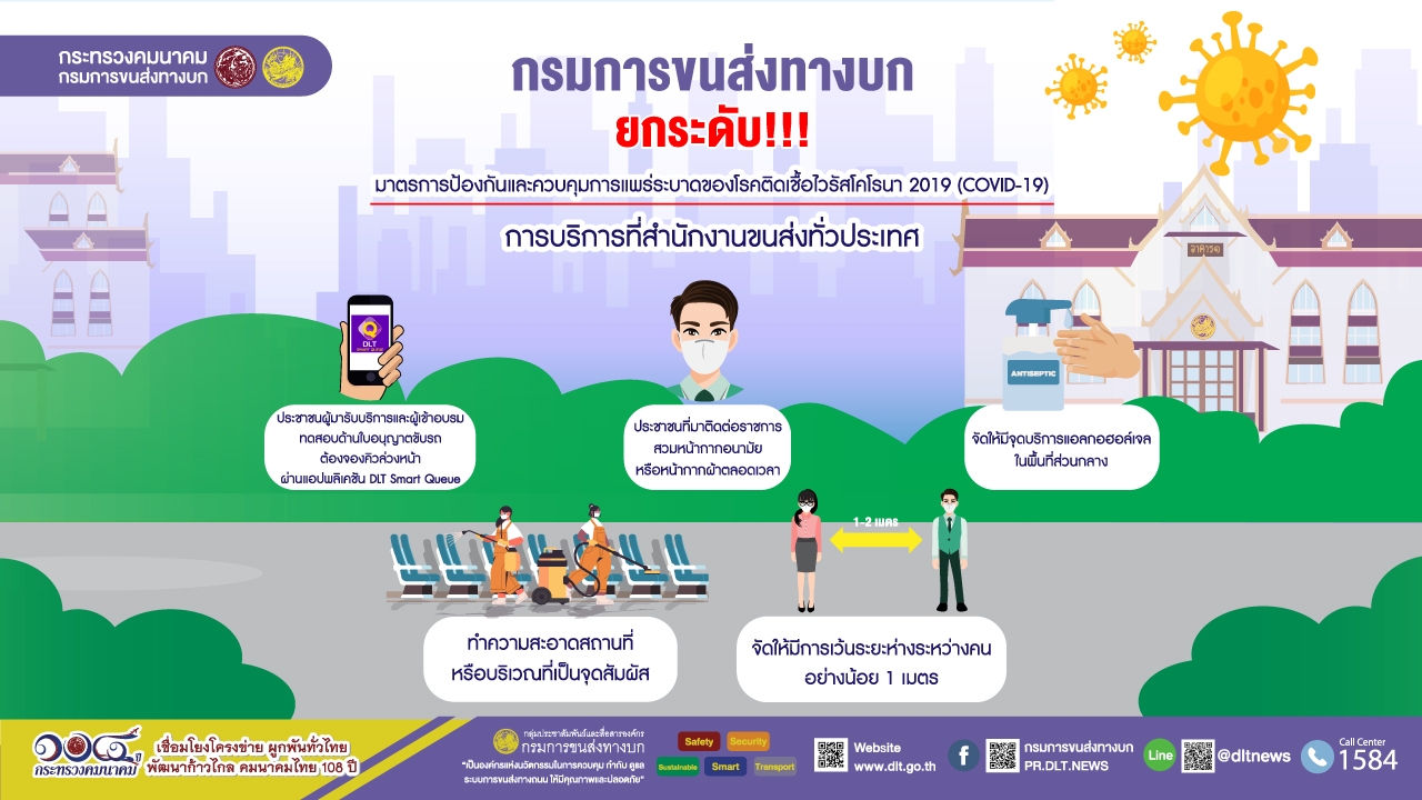 การให้บริการที่สำนักงานขนส่งทุกแห่งทั่วประเทศ กำชับให้เจ้าหน้าที่ทุกคนดำเนินการตามมาตรการป้องกันโรคอย่างเคร่งครัด บริหารจัดการจำนวนประชาชนผู้มารับบริการและผู้เข้าอบรมและทดสอบด้านใบอนุญาตขับรถ ไม่ให้แออัดจนเกินไป โดยให้จองคิวล่วงหน้าผ่านแอปพลิเคชัน DLT Smart Queue จัดที่นั่งคอย ที่นั่งอบรมและทดสอบ ให้มีการเว้นระยะห่างระหว่างคนอย่างน้อย 1 เมตร เพิ่มความถี่ในการทำความสะอาดสถานที่ สิ่งอำนวยความสะดวก และในพื้นที่หรือบริเวณที่เป็นจุดสัมผัส เช่น มือจับปิด-เปิดประตู พร้อมจัดให้มีจุดบริการแอลกอฮอล์เจลในพื้นที่ส่วนกลางที่มีการใช้งานร่วมกัน ในส่วนของขั้นตอนการดำเนินการด้านใบอนุญาตขับรถที่ต้องมีการสัมผัสเครื่องมืออุปกรณ์ เช่น รถที่ใช้ในทดสอบการขับรถ เครื่องทดสอบ E-exam และอุปกรณ์ทดสอบสมรรถภาพทางร่างกาย ให้ทำความสะอาดเครื่องมืออุปกรณ์ด้วยแอลกอฮอล์ฆ่าเชื้อทุกครั้ง ก่อนเริ่มให้บริการคนถัดไป โดยขอให้ประชาชนที่มาติดต่อราชการสวมหน้ากากอนามัยหรือหน้ากากผ้าตลอดเวลา และปฏิบัติตามคำแนะนำของเจ้าหน้าที่เพื่อให้การป้องกันและควบคุมการแพร่ระบาดของโรคติดเชื้อไวรัสโคโรนา 2019 (COVID-19) เป็นไปอย่างมีประสิทธิภาพ