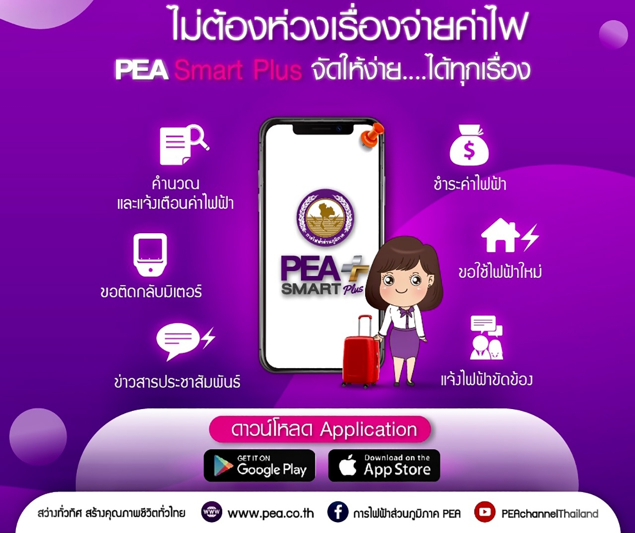 ทั้งนี้ ผู้ใช้ไฟฟ้าสามารถดาวน์โหลดแอปพลิเคชัน PEA Smart Plus ได้ที่ App Store (สำหรับมือถือระบบปฏิบัติการ iOS) และ Google play (สำหรับมือถือระบบปฏิบัติการANDROID)