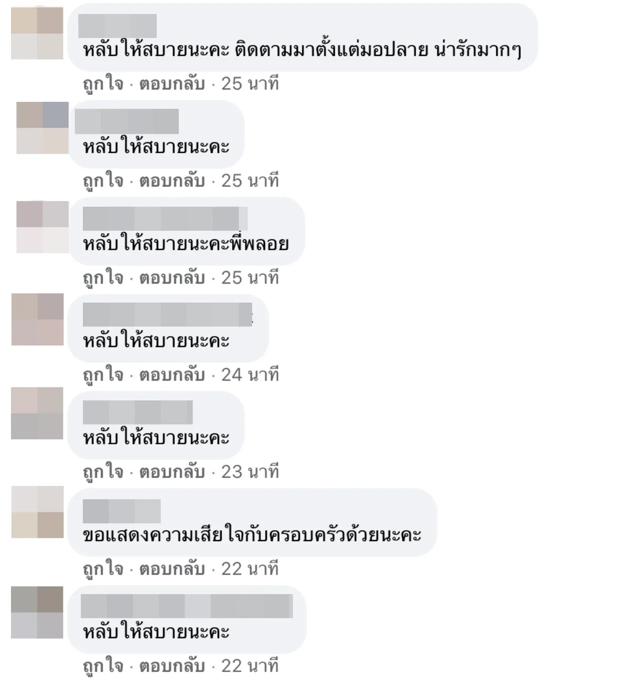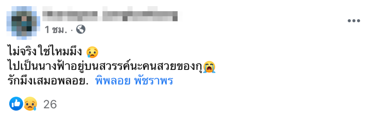 ขณะที่ เฟซบุ๊กของ พิพลอย ได้มีเพื่อนผู้เสียชีวิต และแฟนคลับที่ติดตามผลงาน เข้ามาโพสต์อาลัย และแสดงความเสียใจกันเป็นจำนวนมาก.