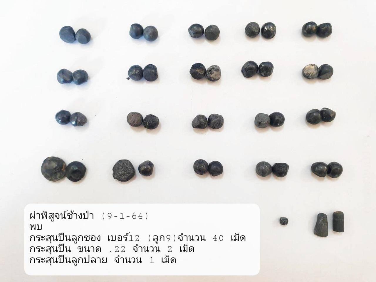 พบกระสุนปืนลูกซอง เบอร์ 12 ขนาด 9 จำนวน 40 เม็ด ลูกกระสุนปืน ขนาด .22 จำนวน 2 เม็ด และลูกปราย จำนวน 1 เม็ด และพบตรงจุดสำคัญบริเวณใต้เบ้าตา 2 ลูก ซึ่งเป็นเหตุทำให้ตาขวามีอาการอักเสบ มองไม่เห็น มีลักษณะเป็นฝ้าขาว
