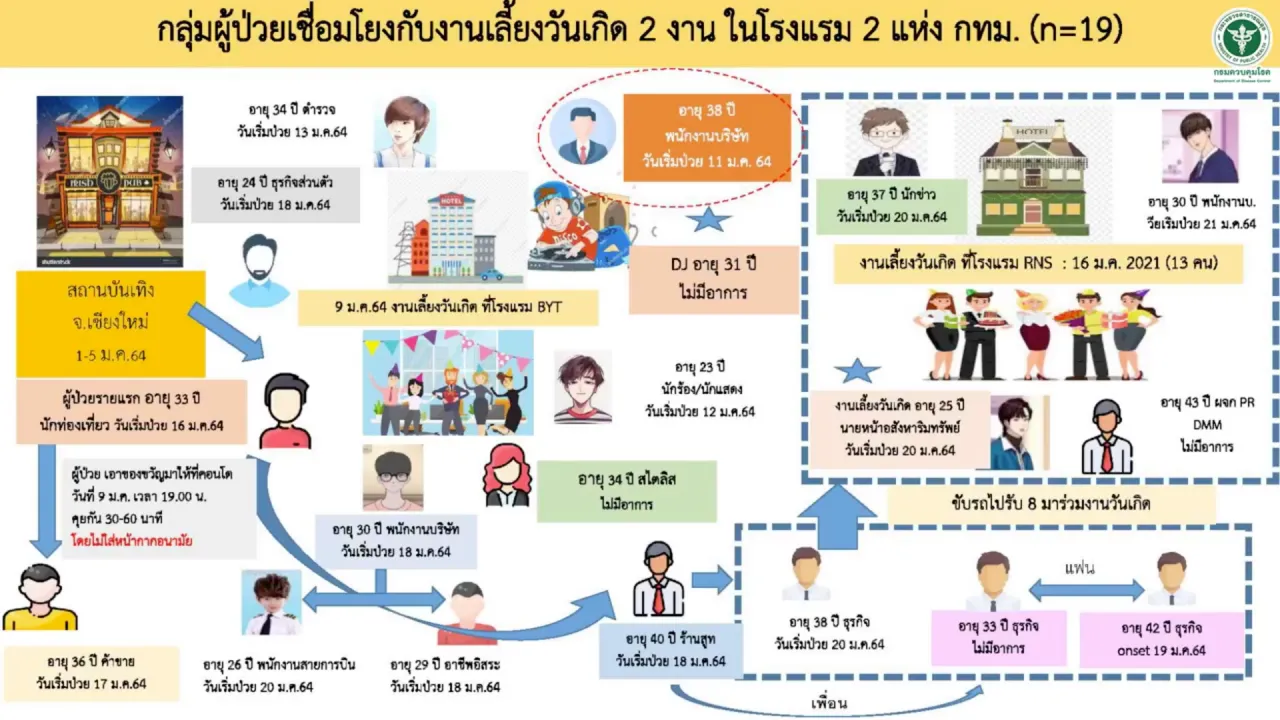 กรมควบคุมโรค เผยเคส "ดีเจมะตูม" พบติดโควิด-19 เป็นกลุ่มก้อนจากงานปาร์ตี้ ป่วยแล้ว 19 คน มีนักร้องที่เป็นนักแสดงรวมอยู่ด้วย