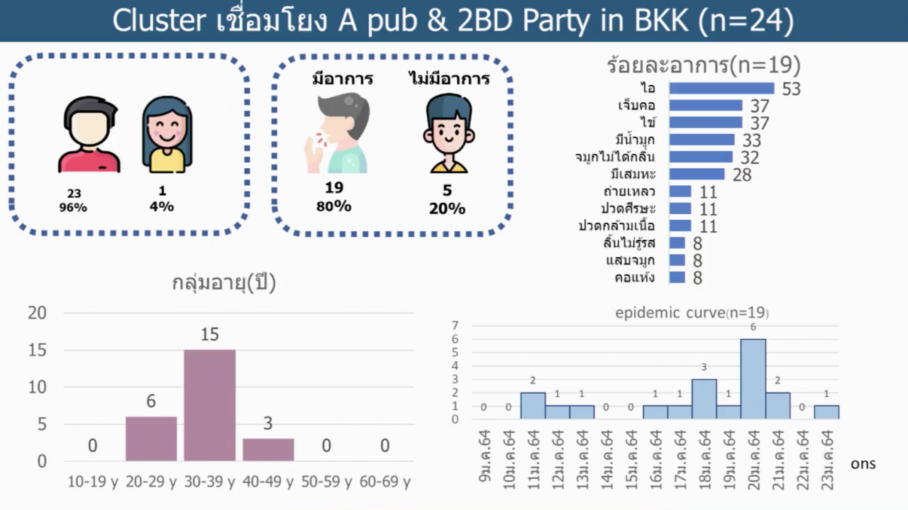 ขณะที่ ผลการสอบสวนโรค กรณีดีเจมะตูม นายเตชินท์ พลอยเพชร ติดโควิด-19 ว่า พบการติดเชื้อเชื่อมโยงงานฉลองปาร์ตี้วันเกิด 2 งาน จากเดิมตรวจพบผู้ติดเชื้อ จำนวน 19 คน เมื่อขยายการค้นหาและตรวจสอบซ้ำในกลุ่มเสี่ยง ทำให้มีผู้ติดเชื้อเพิ่มขึ้นเป็น 24 คน เป็นเพศชาย 23 ราย เพศหญิง 1 ราย อายุระหว่าง 20-49 ปี และพบการติดเชื้อแบบมีอาการ 80% แบ่งเป็น ไอ 53% เจ็บคอ มีไข้ 37% มีน้ำมูก 33% ไม่ได้กลิ่น 32% ขณะที่บางราย มีการตรวจพบอาการในระยะหลัง