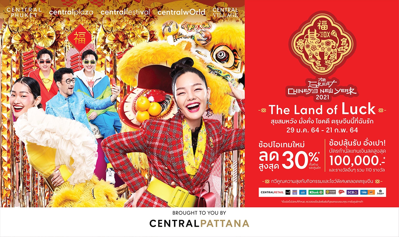 The Great Chinese New Year 2021 – “The Land of Luck” ฉลองตรุษจีนในดินแดนแห่ง ‘Luck’ เสริมความมั่งคั่งโชคดีต้อนรับปีฉลูทองมหามงคล อย่างสะอาด ปลอดภัย ที่ศูนย์การค้าเซ็นทรัลทุกสาขา ทั้งเซ็นทรัลเวิลด์, เซ็นทรัลพลาซา, เซ็นทรัลเฟสติวัล, เซ็นทรัล ภูเก็ต และเซ็นทรัล วิลเลจ รวม 33 สาขาทั่วประเทศ ลดสูงสุด 70% จับจ่ายสินค้า New Collection ลดสูงสุด 30% ทั้งศูนย์การค้าและห้างสรรพสินค้า พร้อมลุ้นรับของรางวัลและสิทธิพิเศษมากมาย อร่อยรับทรัพย์กับเมนูเด็ดจากร้านดังภายในศูนย์การค้า สุขทวีคูณกับกิจกรรมแห่งความมงคล ตั้งแต่วันที่ 29 ม.ค. 64 - 21 ก.พ. 64