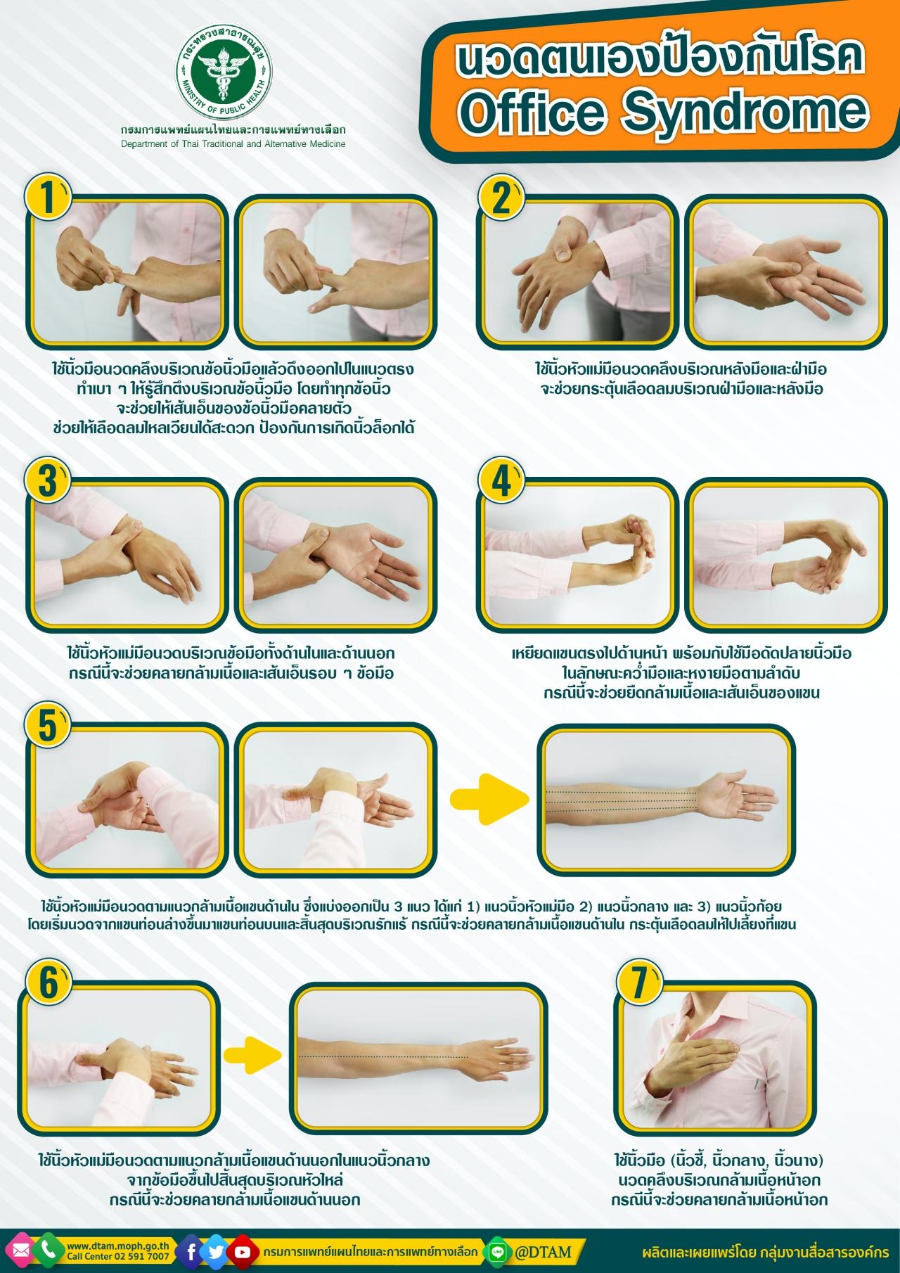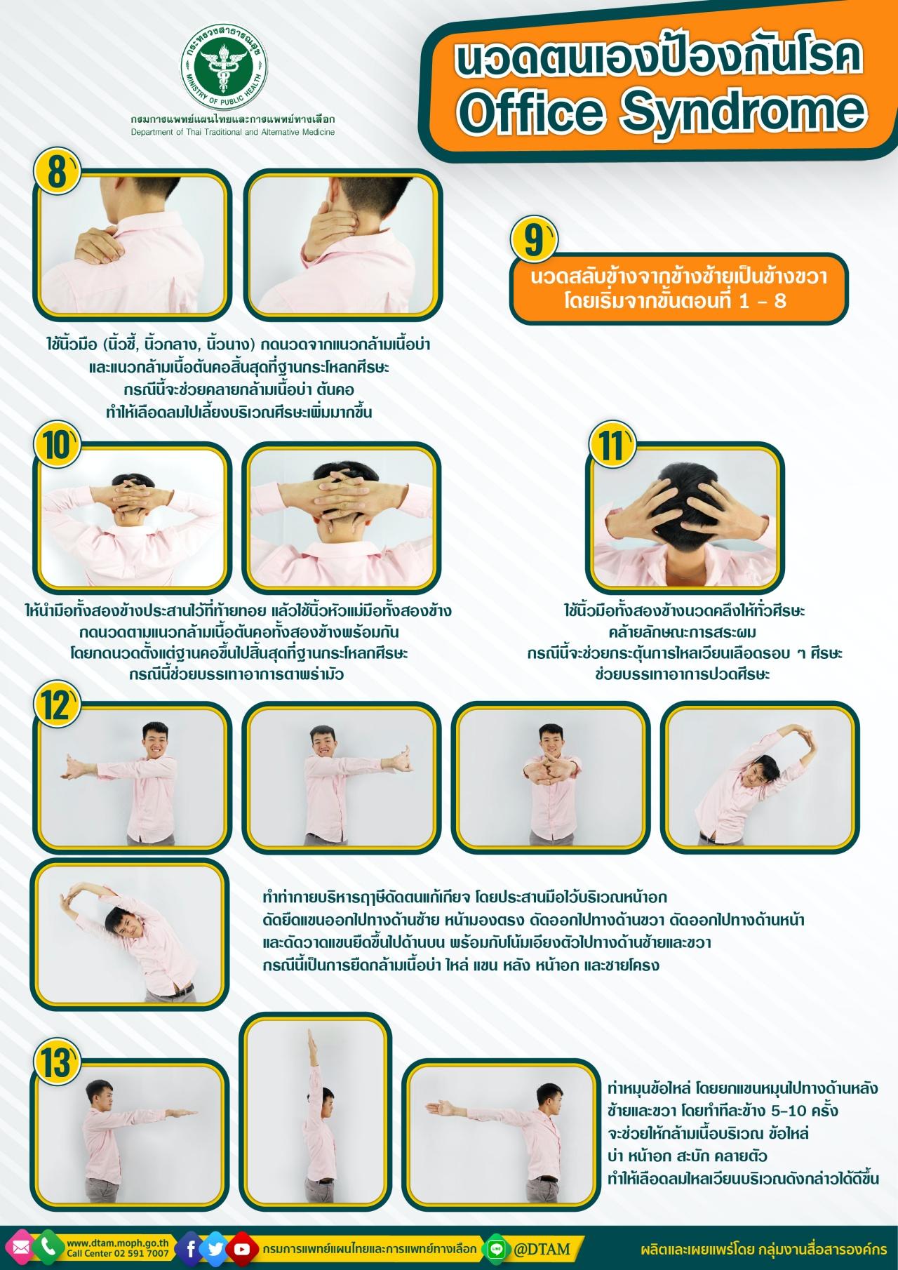 สำหรับทางออกของโรคดังกล่าว ขอแนะนำให้ประชาชนที่ต้องนั่งทำงานนานๆ หมั่นนวดตนเอง เพื่อป้องกันและบรรเทาอาการของโรคออฟฟิศซินโดรม ด้วยวิธีการ 13 ขั้นตอน ดังต่อไปนี้