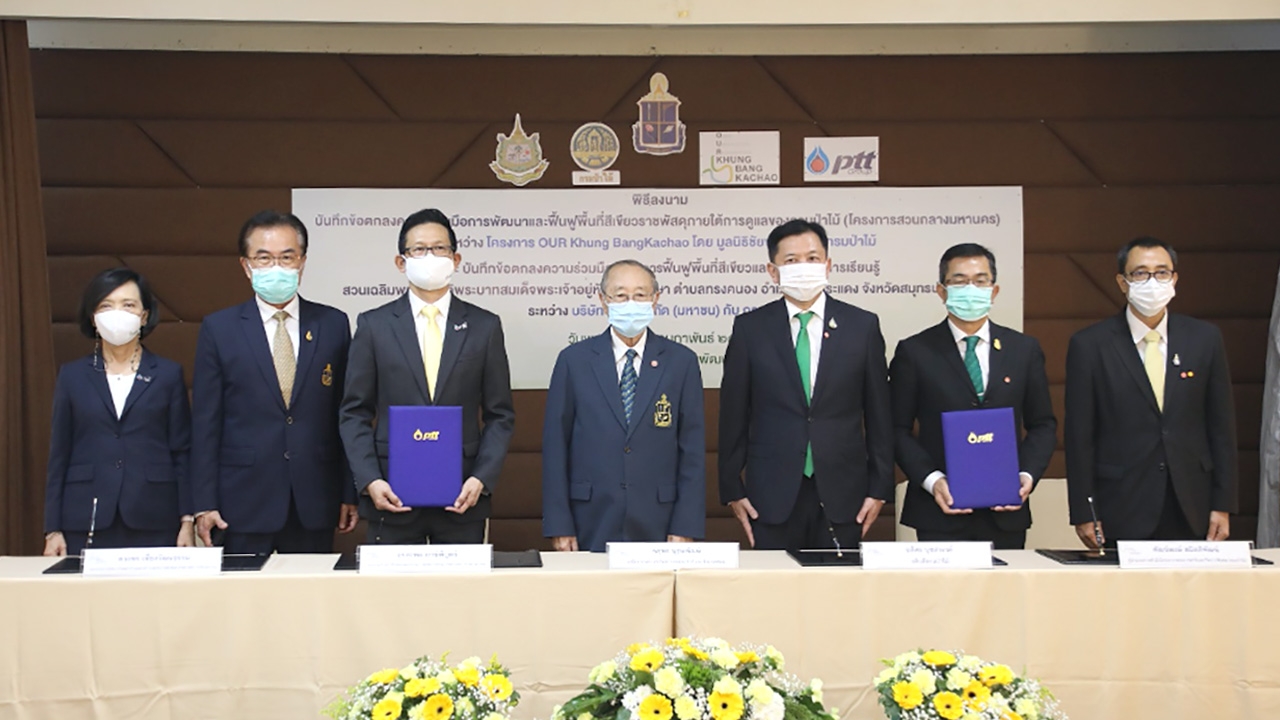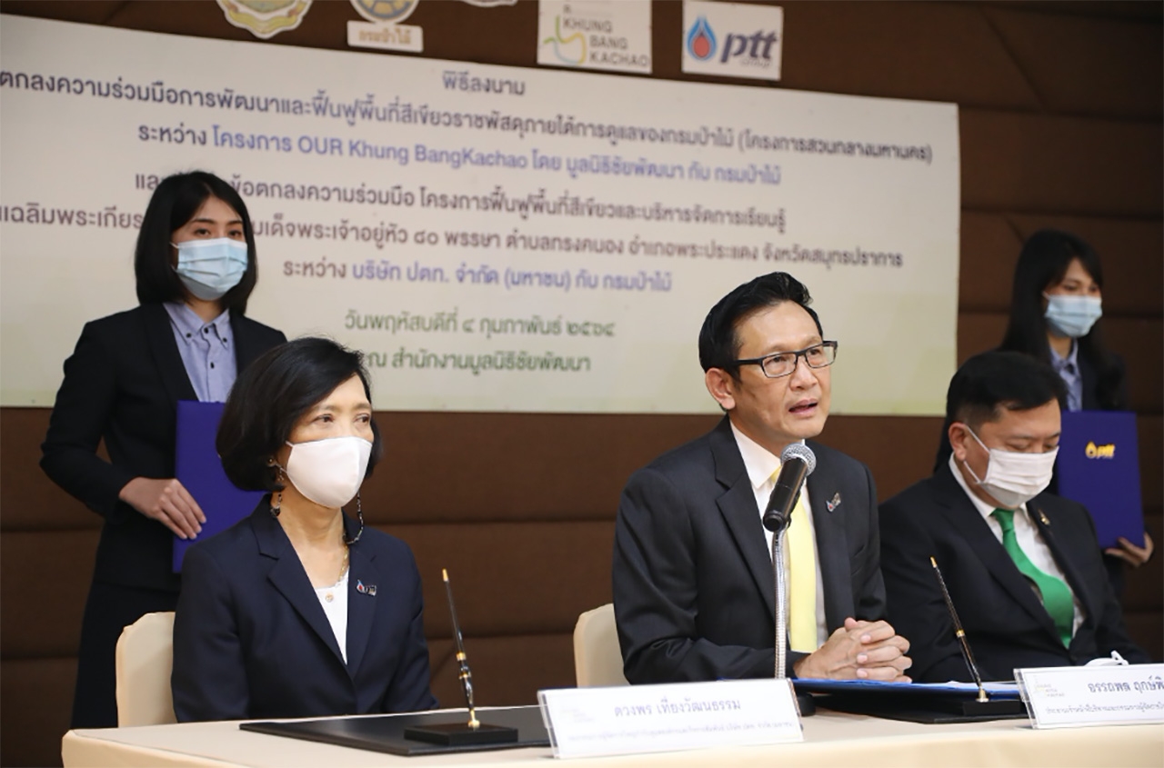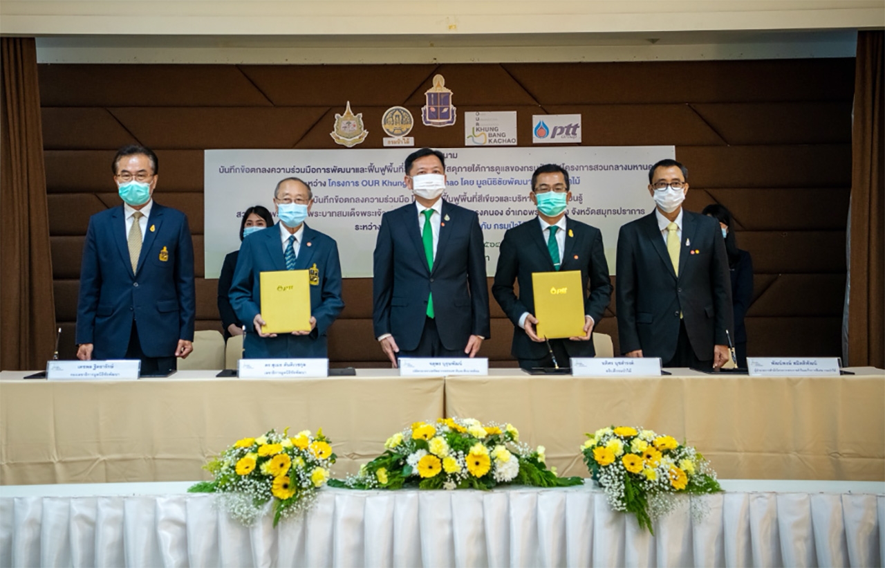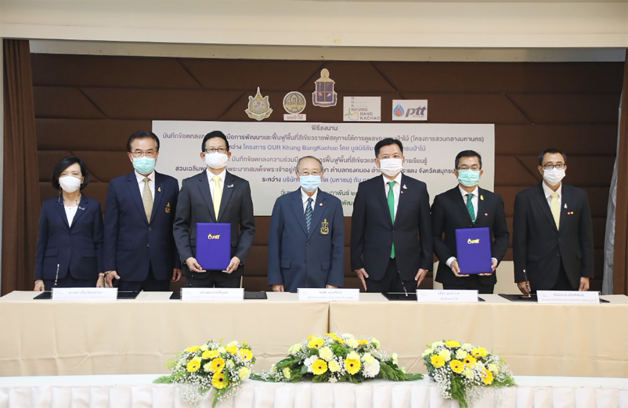 โดยพิธีลงนามบันทึกข้อตกลง (MOU) ทั้ง 2 ฉบับในครั้งนี้ มีคุณจตุพร บุรุษพัฒน์ ปลัดกระทรวงทรัพยากรธรรมชาติและสิ่งแวดล้อม ให้เกียรติเป็นประธานในพิธี พร้อมด้วยแขกผู้มีเกียรติ ดร.สุเมธ ตันติเวชกุล กรรมการและเลขาธิการมูลนิธิชัยพัฒนา ในฐานะประธานคณะกรรมการกำกับการดำเนินงานพัฒนาพื้นที่คุ้งบางกะเจ้าสู่ความยั่งยืน โครงการ “OUR Khung BangKachao” และคุณอดิศร นุชดำรง อธิบดีกรมป่าไม้ คุณอรรถพล ฤกษ์พิบูลย์ ประธานเจ้าหน้าที่บริหารและกรรมการผู้จัดการใหญ่ ปตท. รวมถึงตัวแทนคณะทำงานจากชุมชนร่วมในพิธีลงนามในครั้งนี้ด้วย