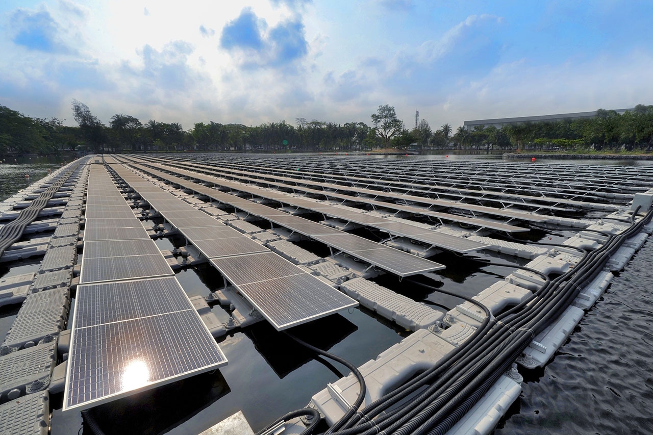 นวัตกรรมพลังงานแสงอาทิตย์แบบทุ่นลอยน้ำแห่งแรกในสวนอุตสาหกรรมไทย ณ สวนอุตสาหกรรมเครือสหพัฒน์ ศรีราชา หนึ่งในโครงการต้นแบบที่ได้รับการสนับสนุนจากรัฐบาลญี่ปุ่น เพื่อลดการปล่อยก๊าซเรือนกระจก