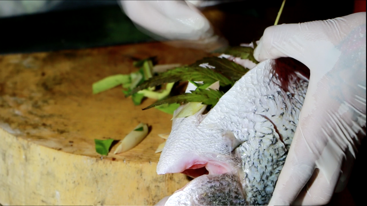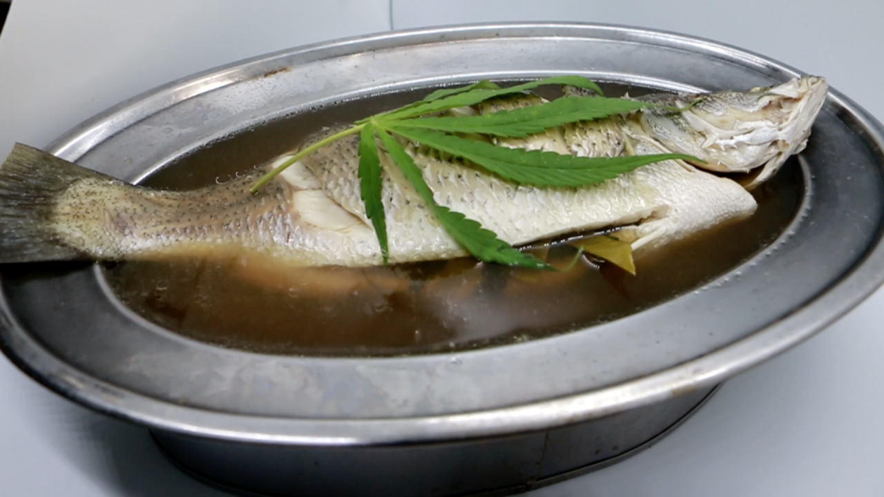 และ "เมนูปลากะพงยิ้มสวย" ที่ใส่ใบกัญชาในพุงปลาพร้อมเครื่องเทศตัวอื่นนำไปนึ่ง ก่อนนำใบกัญชามาวางทับหน้าด้านบน ทางร้านขอรับประกันความอร่อย