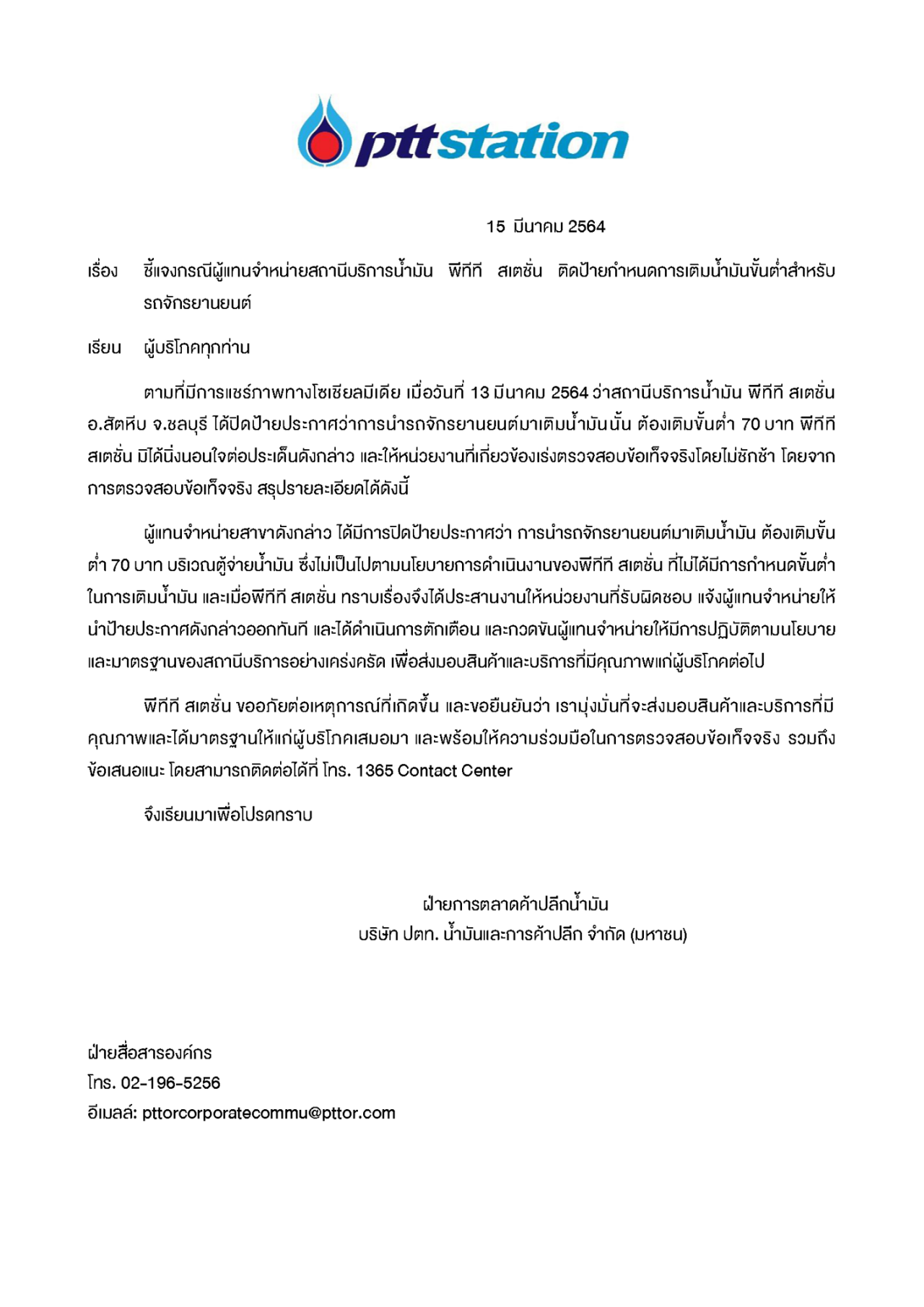 เบื้องต้นได้แจ้งให้ผู้แทนจำหน่ายในสาขาดังกล่าวนำป้ายประกาศออกทันที รวมถึงตักเตือนและกวดขันผู้แทนจำหน่ายให้มีการปฏิบัติตามนโยบายและมาตรฐานของสถานีบริการอย่างเคร่งครัด ทางพีทีที สเตชั่น ขอยืนยันว่า เรามุ่งมั่นที่จะส่งมอบสินค้าและบริการที่มีคุณภาพและได้มาตรฐานให้แก่ผู้บริโภคเสมอมา โดยพร้อมให้ความร่วมมือในการตรวจสอบข้อเท็จจริง และยินดีรับฟังข้อเสนอแนะต่างๆ โดยสามารถติดต่อได้ที่ โทร. 1365 Contact Center เพื่อนำมาพัฒนาการบริการให้ดียิ่งขึ้นต่อไป.