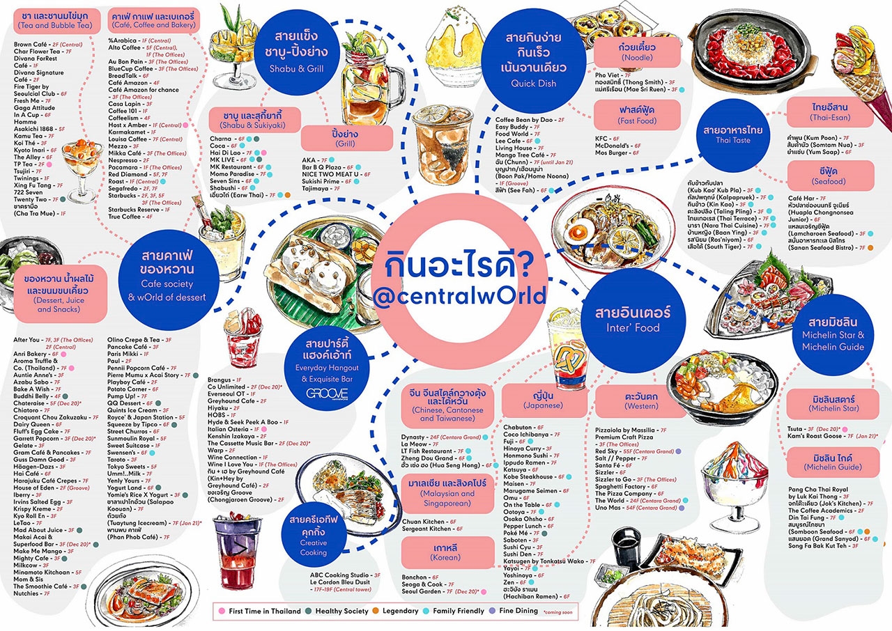 มาค้นพบประสบการณ์ความอร่อยไม่มีที่สิ้นสุดได้ที่เซ็นทรัลเวิลด์ และอย่าลืมพก “ฟู้ดไบเบิ้ล” ติดตัว หรือ สแกน QR Code เตรียมไว้ก่อนมา เพื่อเป็นตัวช่วยในการตามหาร้านอร่อย โดยแบ่งตาม Lifestyle Insight การทานอาหารของคนในปัจจุบัน แบ่งออกได้เป็น 8 สายความอร่อย ได้แก่ สายแข็งชาบู-ปิ้งย่าง, สายมิชลิน (Michelin Star & Michelin Guide), สายคาเฟ่ของหวาน (Café society & wOrld of dessert), สายอินเตอร์ (Asian Lifestyle & Inter’ Food), สาย Thai Taste, สายกินง่ายๆ กินเร็ว เน้นจานเดียว (Quick Service Restaurant, Food World, Live House), สายปาร์ตี้แฮงเอาต์ (Everyday Hangout & Exquisite Bar) และสายครีเอทีฟคุกกิ้ง (Creative Cooking) มาที่เดียวได้อิ่มอร่อยครบทุกเมนูหลากหลายสัญชาติจากทั่วโลกที่ไม่ต้องบินก็ฟินได้