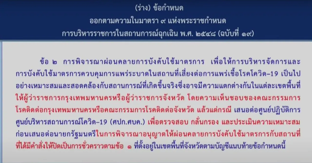 2. การผ่อนคลายการบังคับใช้มาตรการ เพื่อให้การบริหารจัดการ และการบังคับใช้มาตรการควบคุมการแพร่ระบาดในสถานที่เสี่ยงอย่างเหมาะสม โดยให้ผู้ว่าราชการจังหวัดต่างๆ เสนอต่อ ศบค.ชุดเล็ก เพื่อตรวจสอบ ประเมินความเหมาะสม ก่อนเสนอนายกฯ