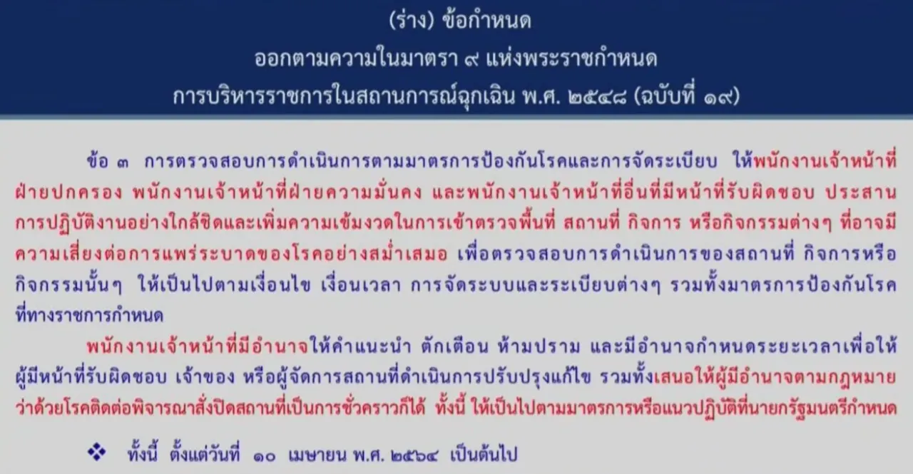 ที่ประชุม ศบค. ชุดเล็กได้แจ้งในที่ประชุม ว่า จะมีการออกข้อกำหนด ซึ่งจะมีผลในคืนนี้หลังเที่ยงคืน เริ่มวันที่ 10 เมษายน โดยมี 3 ข้อใหญ่ๆ คือ