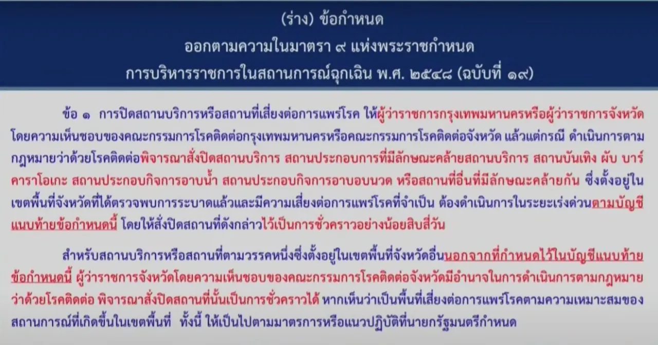 ขณะที่อีก 36 จังหวัดที่เหลือ ผู้ว่าราชการจังหวัด มีอำนาจในการดำเนินการตามกฎหมาย ว่าด้วยโรคติดต่อ พิจารณาสั่งปิดสถานที่นั้นเป็นการชั่วคราวได้ หากเห็นว่าเป็นพื้นที่เสี่ยงต่อการแพร่โรคตามความเหมาะสมของสถานการณ์ที่เกิดขึ้นในเขตพื้นที่