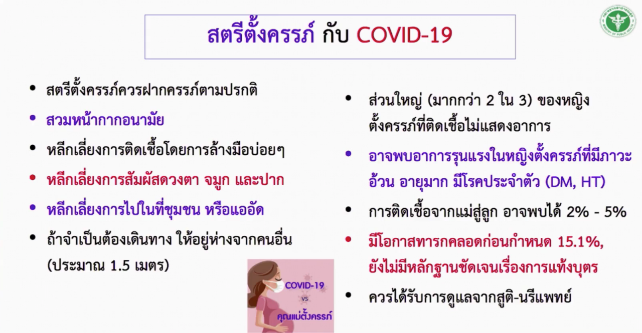 อธิบดีกรมการแพทย์ คลายความสงสัยกรณี “หญิงตั้งครรภ์ติดเชื้อโควิด-19” ย้ำข้อควรปฏิบัติ เผย ติดเชื้อจากแม่สู่ลูกได้ มีโอกาสคลอดก่อนกำหนด แต่ไม่มีหลักฐานชัดเรื่องแท้ง