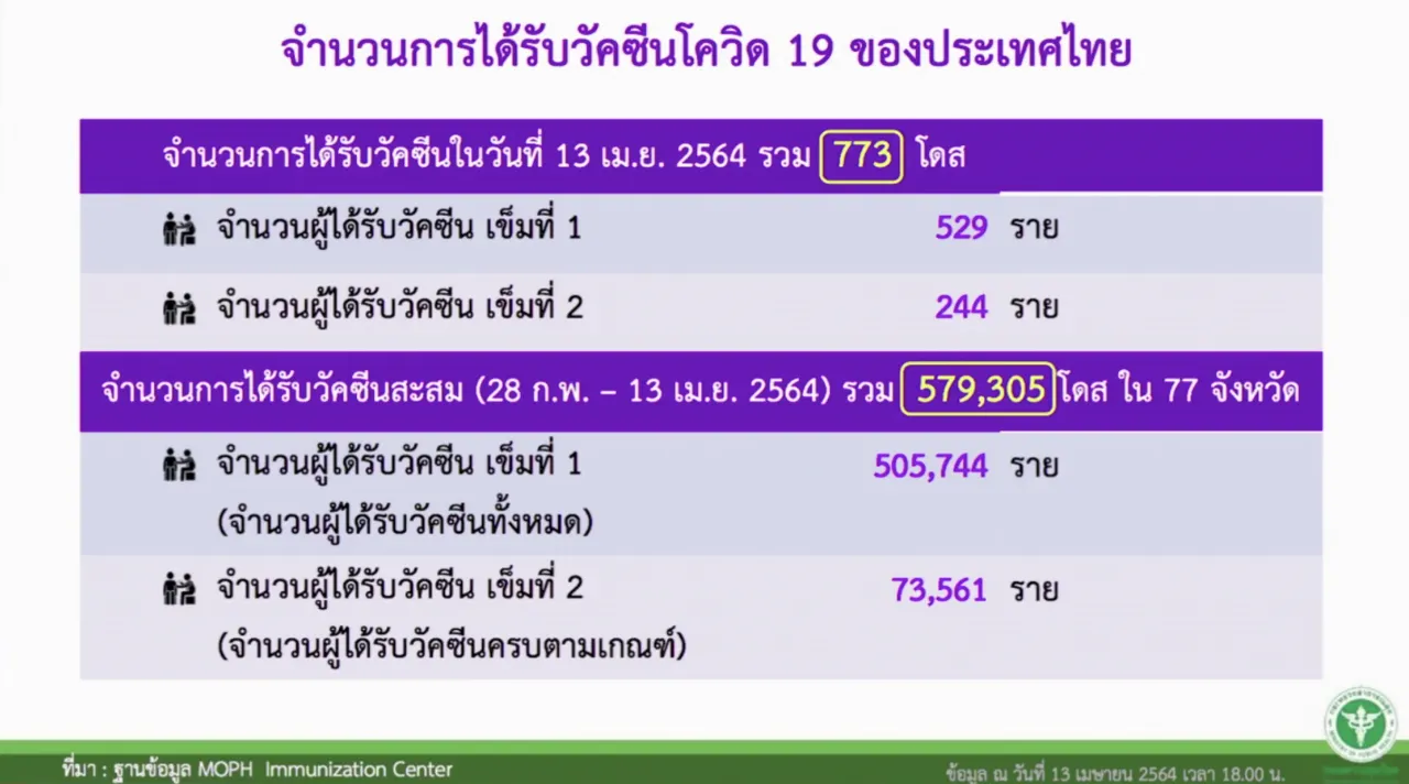 จำนวนผู้รับวัคซีนสะสม (28 ก.พ.-13 เม.ย. 2564) 579,305 โดส ในพื้นที่ 77 จังหวัด