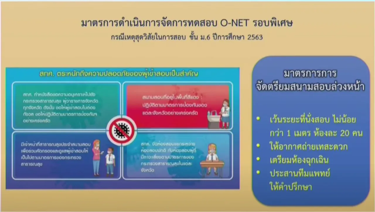 ทั้งนี้ ทาง ศบค. อนุมัติให้ สทศ. จัดสอบได้ โดยต้องคุมเข้มมาตรการดำเนินการจัดการสอบ O-NET รอบพิเศษ กรณีเหตุสุดวิสัยในการสอบชั้น ม.6 ปีการศึกษา 2563 ดังนี้