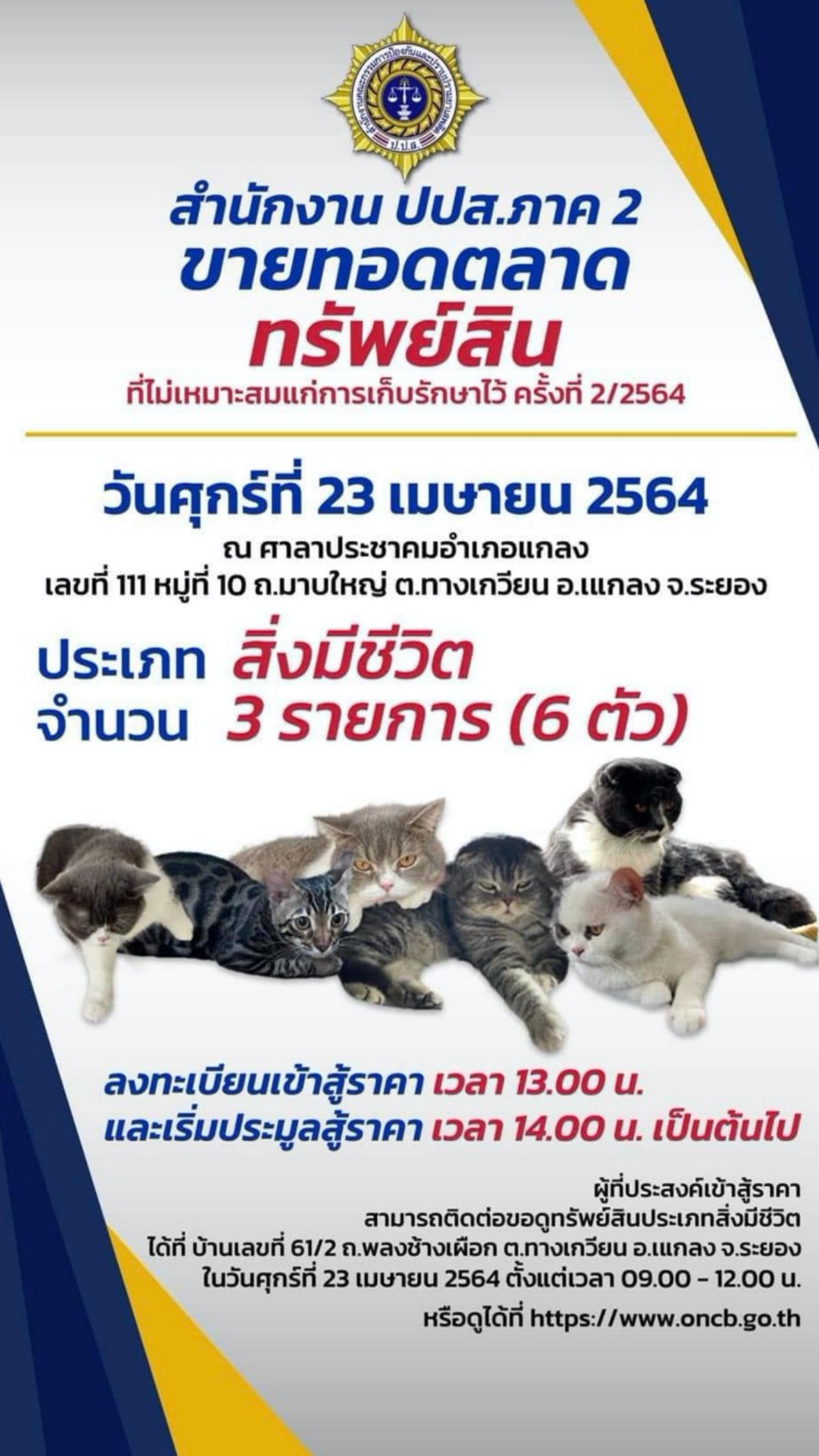 สำนักงาน ป.ป.ส.ภาค 2 เตรียมเปิดประมูล 6 แมวเหมียวของกลาง "กุ๊ก ระยอง" ในวันศุกร์ที่ 23 เม.ย. 2564 ที่ศาลาประชาคมอำเภอแกลง จ.ระยอง