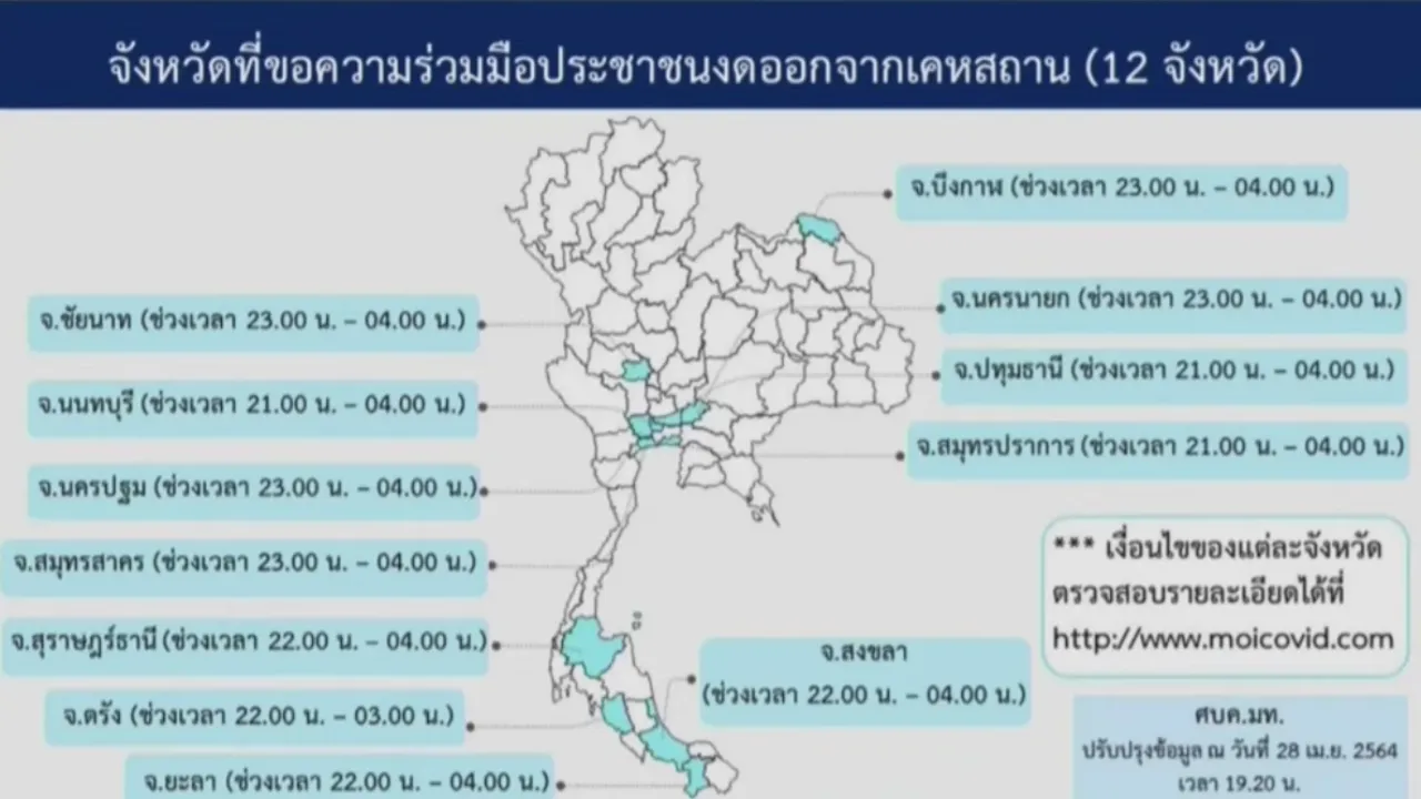 เปิดรายชื่อ 12 จังหวัด ขอความร่วมมือประชาชน "งดออกจากเคหสถาน" ตามเวลาที่กำหนด เพื่อป้องกันการแพร่ระบาดของไวรัส "โควิด-19"