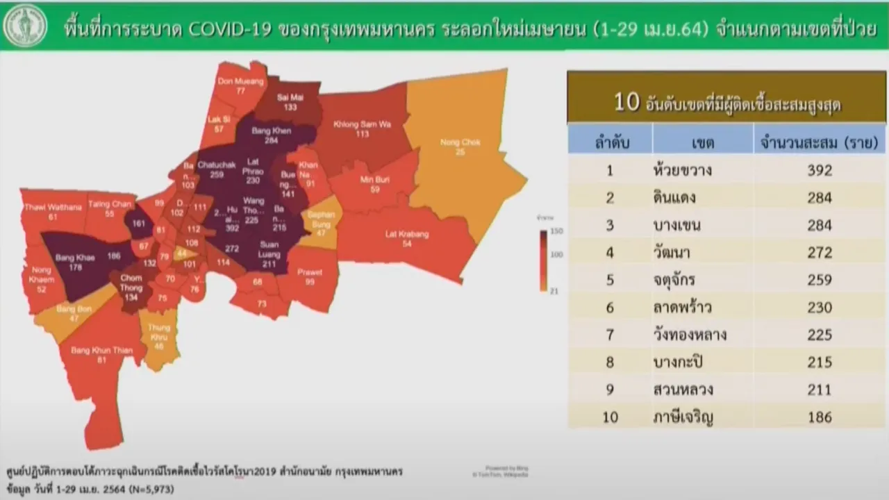 พญ.อภิสมัย ศรีรังสรรค์ กล่าวในการแถลงของ ศบค. ประจำวันที่ 3 พ.ค. ระบุว่า ที่ประชุม ศบค. มีการพูดคุยเกี่ยวกับพื้นที่ กรุงเทพฯ เป็นพิเศษ ซึ่งทิศทางของผู้ติดเชื้อจะเห็นได้ชัดว่า ผู้ติดเชื้อรายวันระลอกใหม่ สะสมทั่วประเทศ 40,121 ราย เป็นผู้ติดเชื้อใน กทม. ถึง 13,283 ราย ทั้งนี้ ปัจจัยเสี่ยงแบ่งเป็น สถานบันเทิง 1,884 ราย, ตลาด ชุมชน ขนส่ง 674 ราย, การสัมผัสผู้ป่วยยืนยันก่อนหน้า 3,839 ราย และปัจจัยเสี่ยงอื่นๆ 6,886 ราย