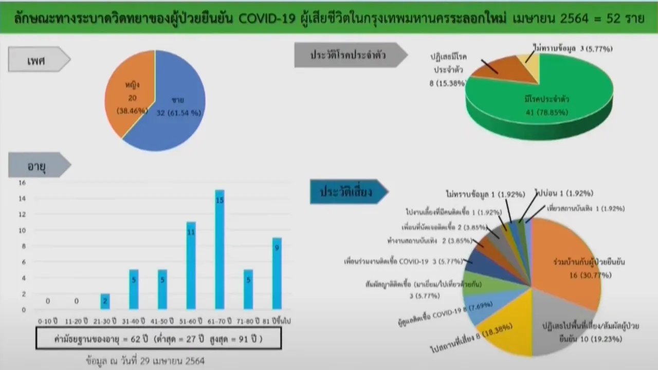 ทั้งนี้ กทม. ได้รายงานการวิเคราะห์เกี่ยวกับผู้เสียชีวิต ซึ่งในการระบาดระลอกใหม่นี้ กทม. มีผู้เสียชีวิต 52 ราย อายุอยู่ระหว่าง 27-91 ปี ปัจจัยเสี่ยงที่สำคัญ คือ มีประวัติร่วมบ้านกับผู้ป่วยยืนยัน และปัจจัยเสี่ยงอื่นๆ อย่างการพบผู้ป่วยจำนวนมาก ในมหาวิทยาลัย โรงเรียน และร้านอาหาร ซึ่งเป็นเหตุที่ทำไมเราถึงไม่อนุญาตให้รับประทานอาหารที่ร้าน ในเขตจังหวัดพื้นที่ควบคุมสูงสุด ก็เนื่องมาจากการสอบไทม์ไลน์ และซักประวัติติดเชื้อ และเสียชีวิต ซึ่งกลุ่มนี้ พบว่าหลายคนมีการสังสรรค์กันในร้าน มีการพบปะเพื่อน และคนในครอบครัว ซึ่งก็เห็นใจผู้ประกอบการหลายร้านที่วางมาตรการเข้มข้น แต่อยากให้ตระหนักว่า เมื่อผู้ติดเชื้อในกรุงเทพฯ ค่อนข้างสูง เรามีความเป็นห่วงในเรื่องของการจัดสรรทรัพยากรด้านสาธารณสุขที่จะดูแลประชาชนให้ปลอดภัย จึงจำเป็นต้องออกมาตรการเข้มข้นสูงสุด แต่เมื่อสถานการณ์ดีขึ้น ก็จะประกาศมาตรการผ่อนคลายตามมา
