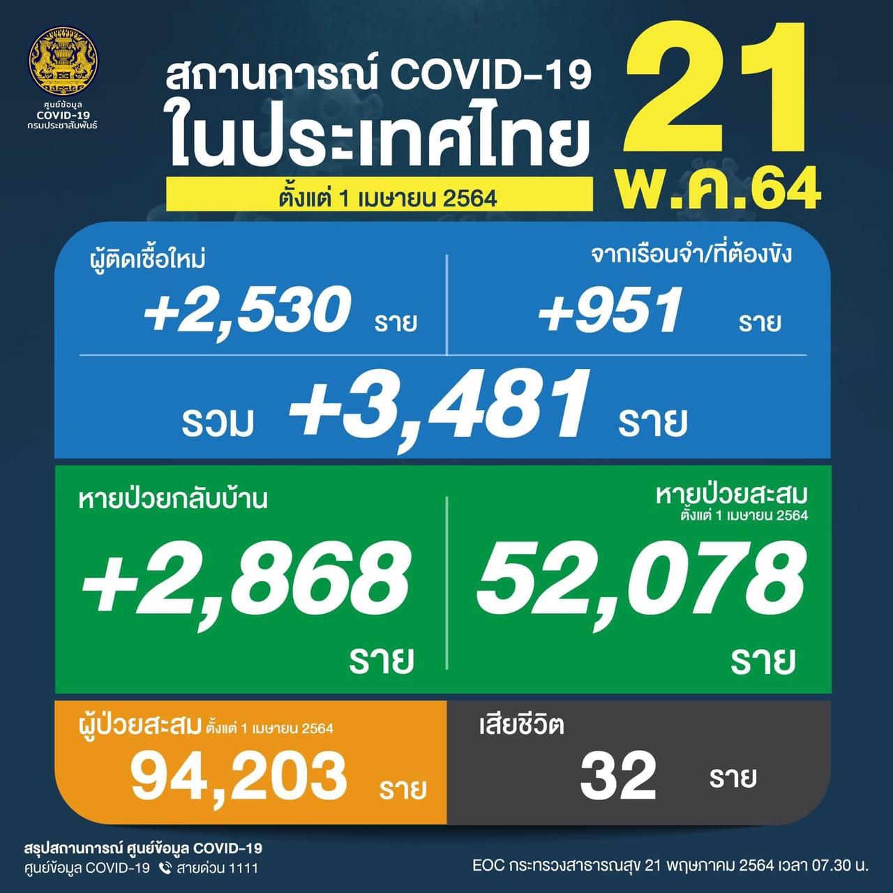 ผู้สื่อข่าวรายงานว่า กระทรวงสาธารณสุข ได้รายงานสถานการณ์โควิด-19 ประจำวันเบื้องต้น โดยข้อมูล ณ วันที่ 21 พ.ค. 2564 มีผู้ป่วยผู้ติดเชื้อรายใหม่เพิ่มสูงขึ้นอีก 3,481 คน แยกเป็นทั่วไป 2,530 ราย และจากเรือนจำ/ที่ต้องขัง 951 ราย ทำให้มีผู้ป่วยสะสม (ตั้งแต่ 1 เม.ย. 2564) 94,203 ราย มีผู้เสียชีวิตเพิ่มอีก 32 ศพ
