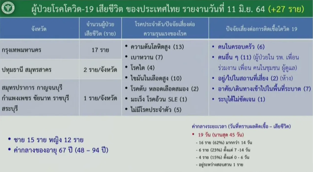 ศบค. แถลงรายละเอียดผู้เสียชีวิตจากโควิด-19 วันนี้ดับ 27 ศพ อายุมากที่สุด 94 ปี ขณะที่ กรุงเทพฯ มีผู้เสียชีวิตมากที่สุด 17 ศพ