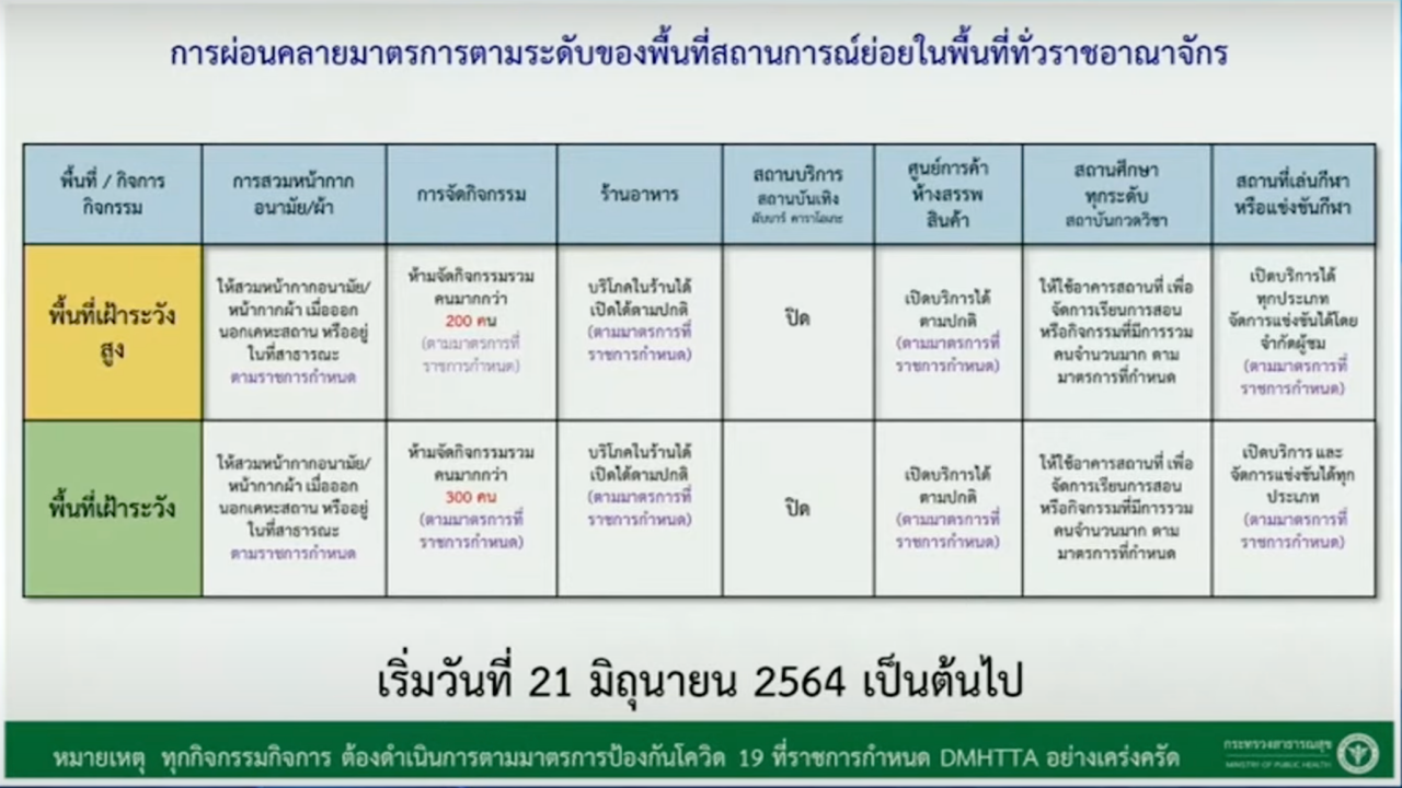 ทั้งนี้ ศบค. มีมติเห็นชอบ และให้เริ่มผ่อนคลายได้ตั้งแต่วันที่ 21 มิถุนายน 2564 เป็นต้นไป ซึ่งจะมีข้อกำหนดออกมาทางราชกิจจานุเบกษาต่อไป.