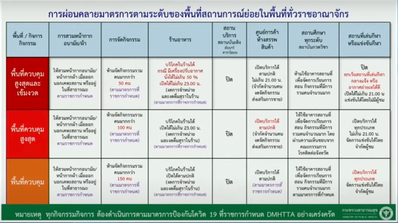 ในส่วนของ ร้านอาหาร พื้นที่ควบคุมสูงสุด และเข้มงวด (สีแดงเข้ม) บริโภคในร้านได้ กรณีมีเครื่องปรับอากาศให้นั่งได้ไม่เกิน 50% เปิดได้ไม่เกิน 23.00 น. (งดการจำหน่าย และดื่มสุราในร้าน), พื้นที่ควบคุมสูงสุด (สีแดง) บริโภคในร้านได้ เปิดไม่เกิน 23.00 น. (งดการจำหน่าย และดื่มสุราในร้าน), พื้นที่ควบคุม (สีส้ม) บริโภคในร้านได้ เปิดได้ตามปกติ (งดการจำหน่าย และดื่มสุราในร้าน) และ พื้นที่เฝ้าระวังสูง (สีเหลือง) บริโภคในร้านได้ เปิดได้ตามปกติ