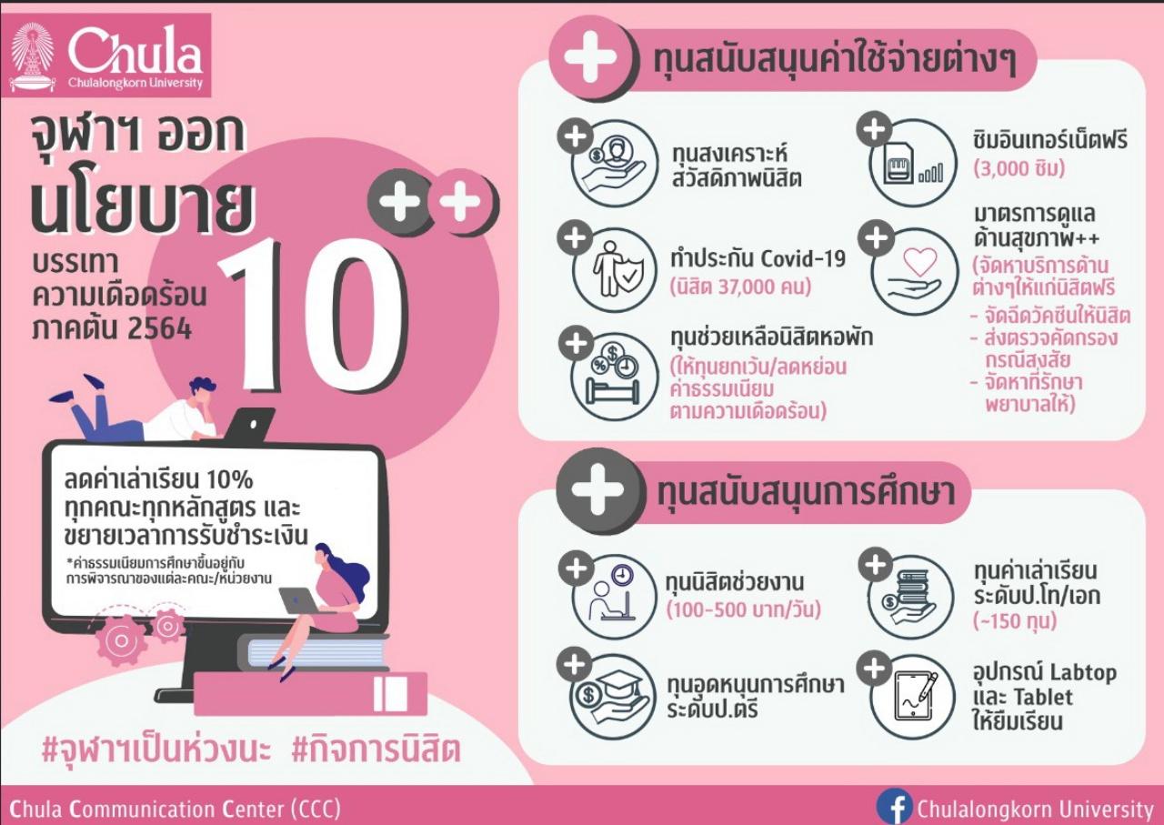วันที่ 8 ก.ค. 2564 ผศ.ดร.ชัยพร ภู่ประเสริฐ รองอธิการบดีด้านการพัฒนานิสิตจุฬาฯ เปิดเผยว่า จากสถานการณ์การระบาดของโควิด-19 ในปัจจุบันที่มีความรุนแรง ส่งผลกระทบต่อนิสิตและครอบครัวจุฬาลงกรณ์มหาวิทยาลัยมีความห่วงใยนิสิตในสถานการณ์ดังกล่าว จึงได้นำนโยบาย "10 พลัส พลัส" ให้ความช่วยเหลือนิสิตที่ได้รับความเดือดร้อนจากโควิด-19 นำมาใช้อีกครั้งในภาคการศึกษาต้น ปีการศึกษา 2564 เพื่อบรรเทาปัญหาความเดือดร้อนให้นิสิตและครอบครัวที่ได้รับผลกระทบในครั้งนี้