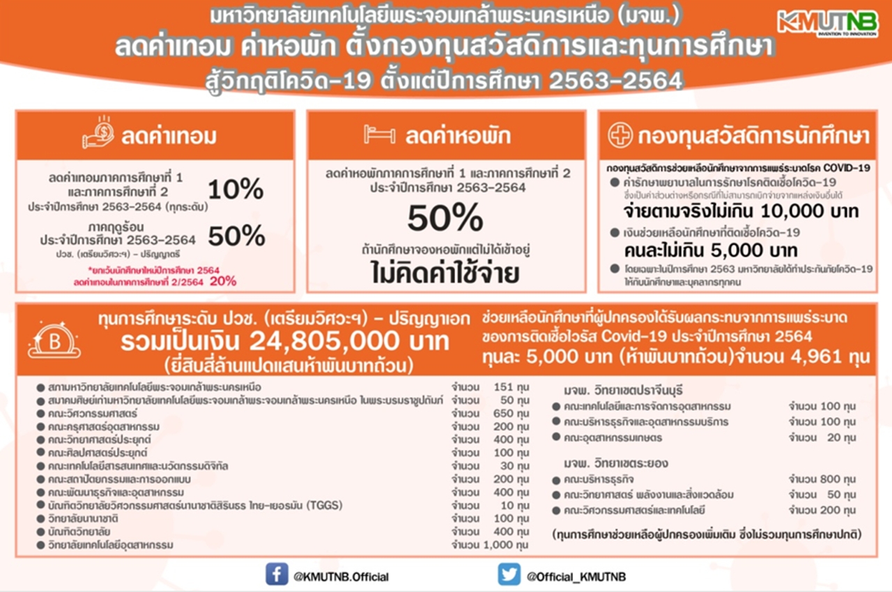 ศ.ดร.สุชาติ เซี่ยงฉิน อธิการบดีมหาวิทยาลัยเทคโนโลยีพระจอมเกล้าพระนครเหนือ (มจพ.) กล่าวว่า จากสถานการณ์โควิด-19 ระลอก 3 ที่กำลังระบาดอย่างหนักอยู่ในขณะนี้ มจพ. ได้มีมาตรการช่วยเหลือนักศึกษาและผู้ปกครองที่ได้รับผลกระทบ เพื่อบรรเทาความเดือดร้อนทั้งทางตรงและทางอ้อม จึงได้พิจารณาให้ความช่วยเหลือค่าใช้จ่ายต่างๆ แก่นักศึกษา ดังนี้