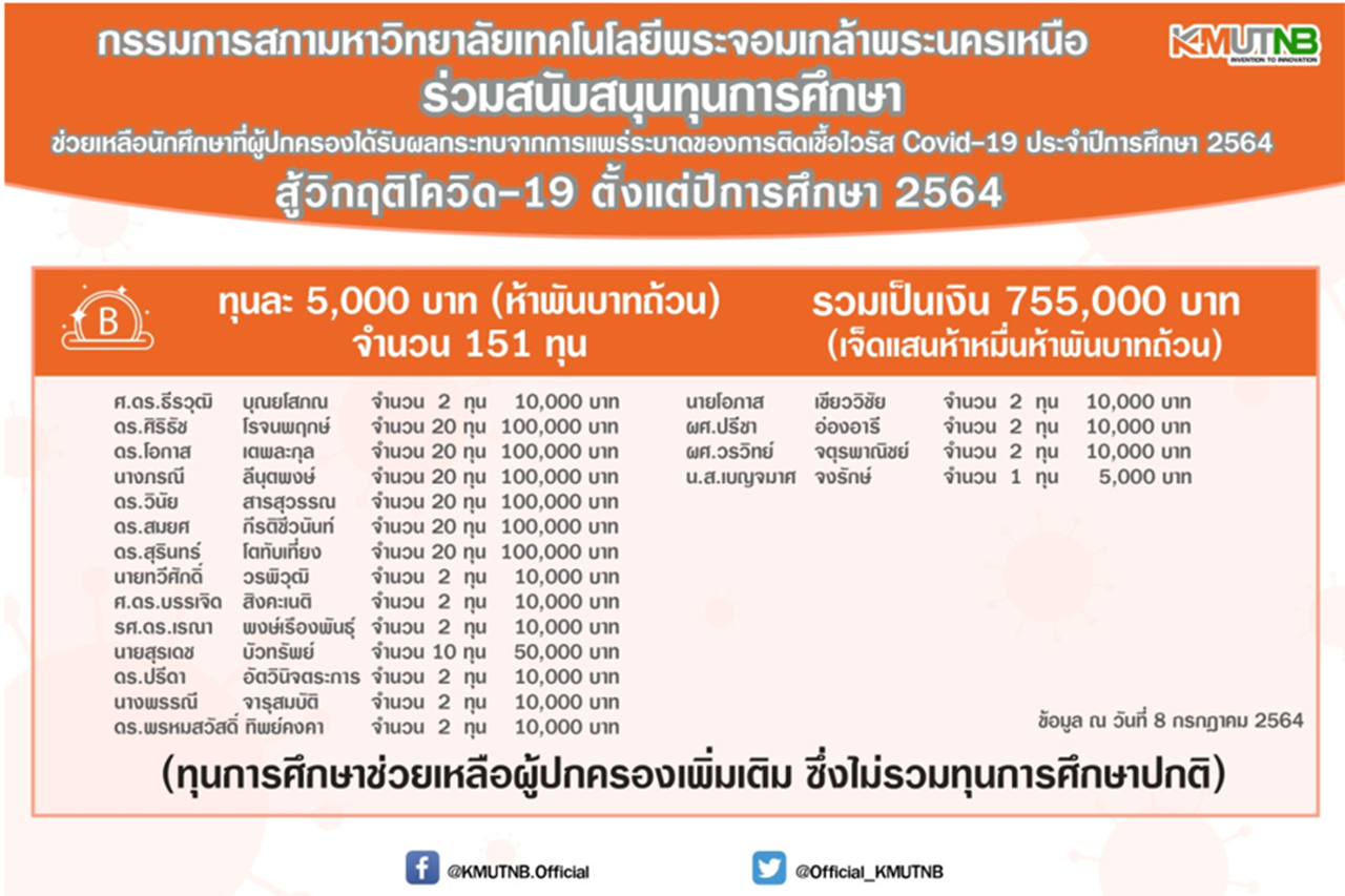 ทั้งนี้ องค์กรเครือข่ายความร่วมมือทางวิชาการของมหาวิทยาลัยเทคโนโลยีพระจอมเกล้าพระนครเหนือ (มจพ.) ได้ร่วมสนับสนุนทุนการศึกษา ช่วยเหลือนักศึกษาที่ผู้ปกครองได้รับผลกระทบจากการแพร่ระบาดของการติดเชื้อไวรัส Covid-19 ประจำปีการศึกษา 2564 ทุนละ 5,000 บาท (ห้าพันบาทถ้วน) จำนวน 45 ทุน รวมเป็นเงิน 225,000 บาท (สองแสนสองหมื่นห้าพันบาทถ้วน) ดังนี้