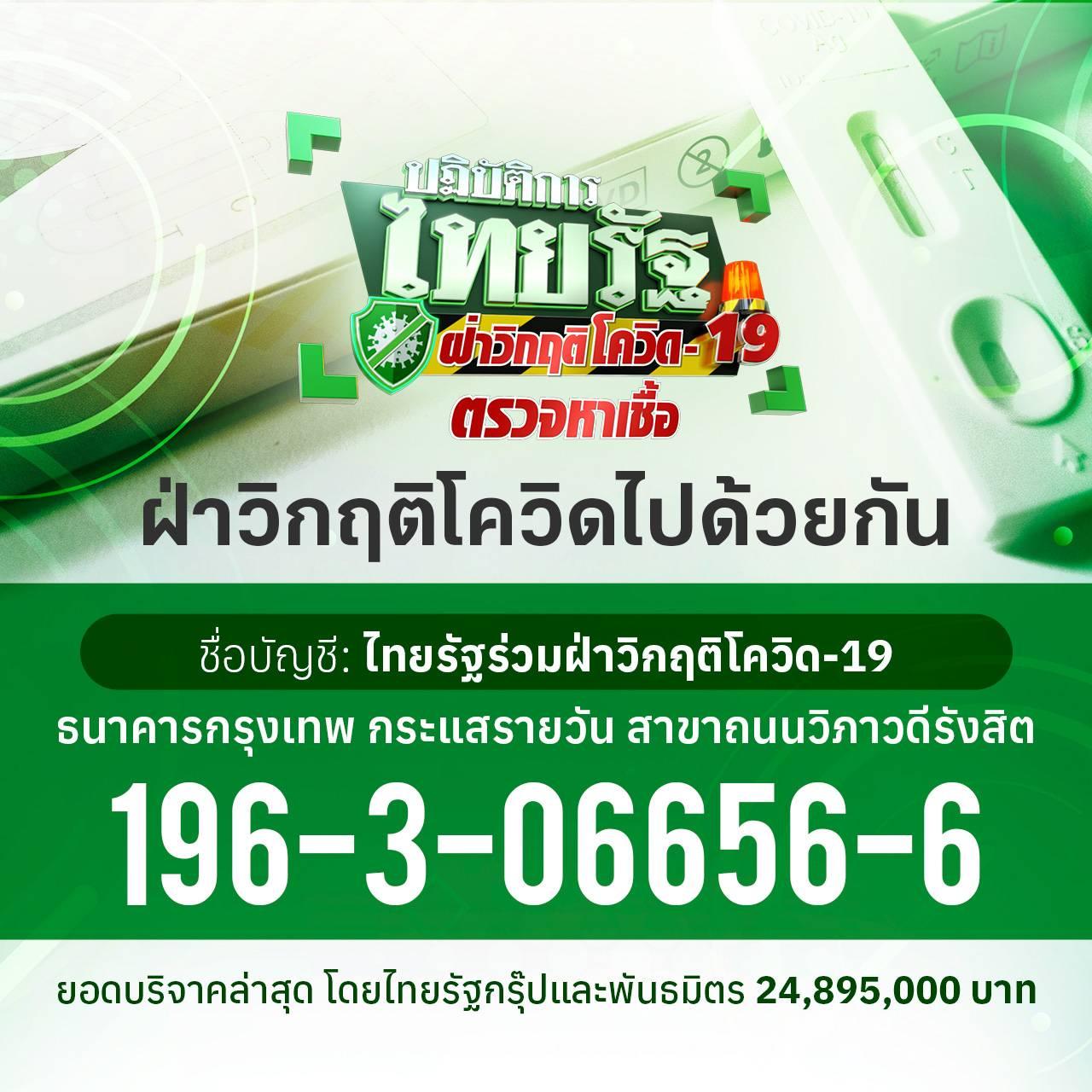 ไทยรัฐกรุ๊ป ขอเชิญชวนประชาชนที่มีกำลังทรัพย์ ร่วมฝ่าวิกฤตินี้ไปด้วยกัน คุณ สามารถเป็นส่วนหนึ่ง ในการร่วมสนับสนุนเงินผ่านโครงการนี้ เงินทั้งหมดที่ได้จะนำไปจัดซื้อชุดตรวจโควิด-19 (Rapid Antigen Test Kit) เพื่อแจกจ่ายผ่านหน่วยงานและสถานพยาบาลโดยเร็วที่สุด