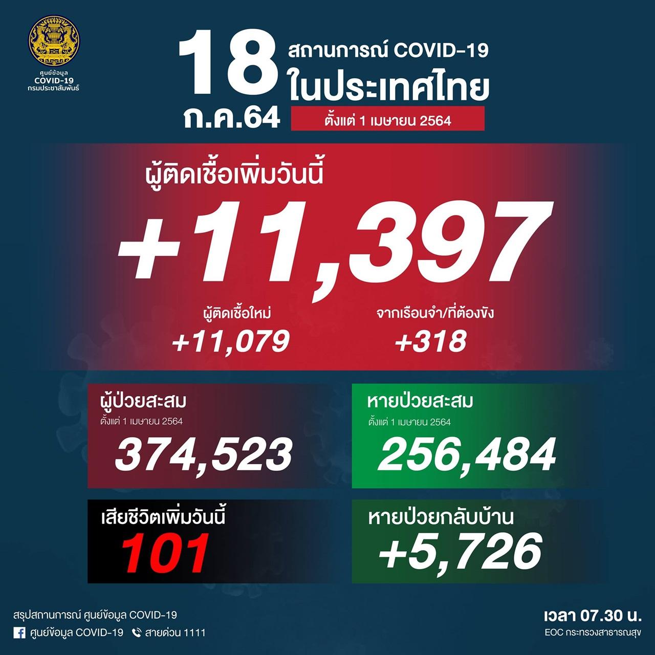 ผู้สื่อข่าวรายงานว่า กระทรวงสาธารณสุข ได้รายงานสถานการณ์โควิด-19 ประจำวันเบื้องต้น โดยข้อมูล ณ วันที่ 18 ก.ค. 2564 มีผู้ป่วยผู้ติดเชื้อรายใหม่ 11,397 ราย แยกเป็นทั่วไป 11,079 ราย และจากเรือนจำ/ที่ต้องขัง 318 ราย ทำให้มีผู้ป่วยสะสม (ตั้งแต่ 1 เม.ย. 2564) จำนวน 374,523 ราย และมีผู้เสียชีวิตเพิ่ม 101 ศพ.