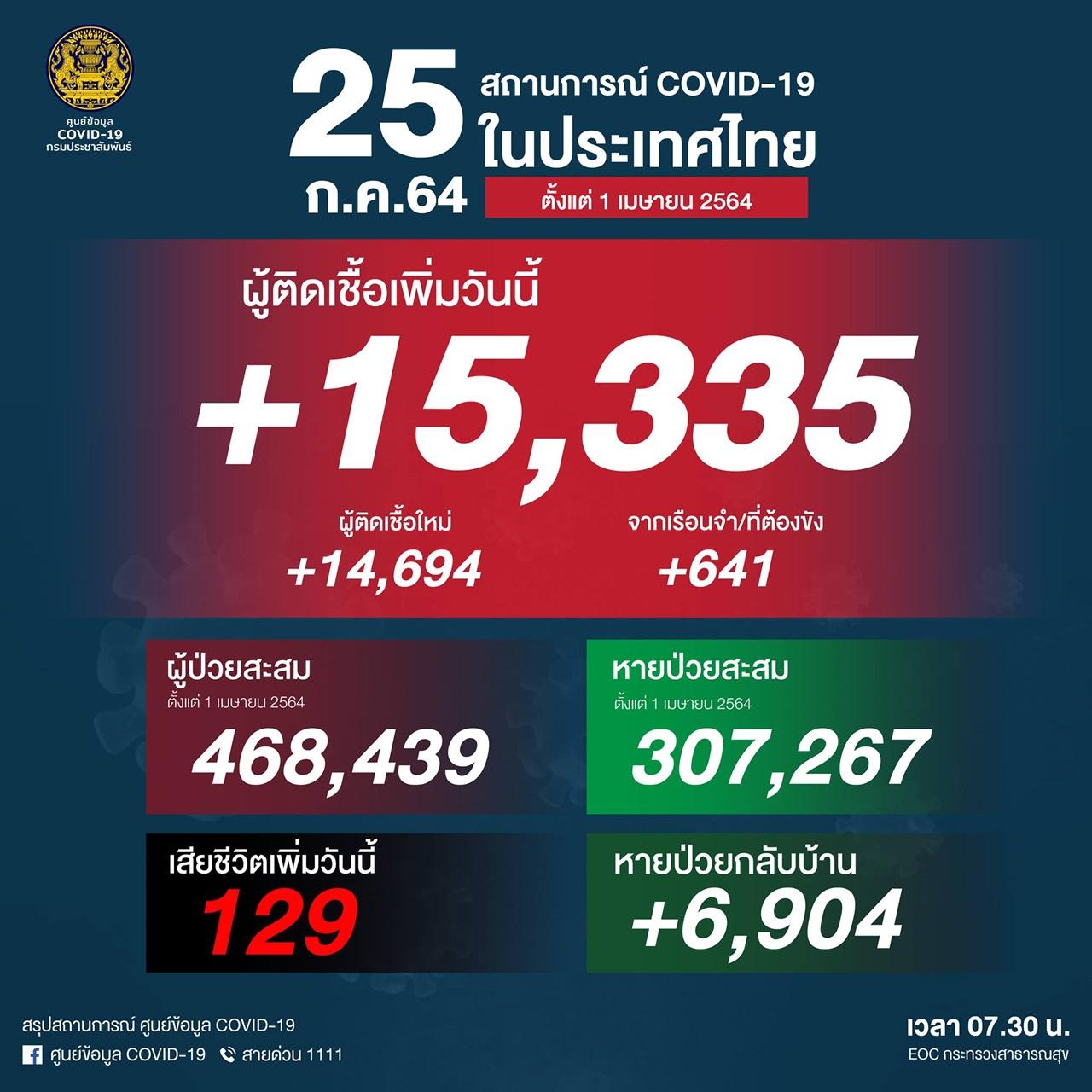 ผู้สื่อข่าวรายงานว่า กระทรวงสาธารณสุข ได้รายงานสถานการณ์โควิด-19 ประจำวันเบื้องต้น โดยข้อมูล ณ วันที่ 25 ก.ค. 2564 มีผู้ป่วยผู้ติดเชื้อรายใหม่ 15,335 ราย แยกเป็นทั่วไป 14,694 ราย และจากเรือนจำ/ที่ต้องขัง 641 ราย ทำให้มีผู้ป่วยสะสม (ตั้งแต่ 1 เม.ย. 2564) จำนวน 468,439 ราย และมีผู้เสียชีวิตเพิ่ม 129 ศพ.
