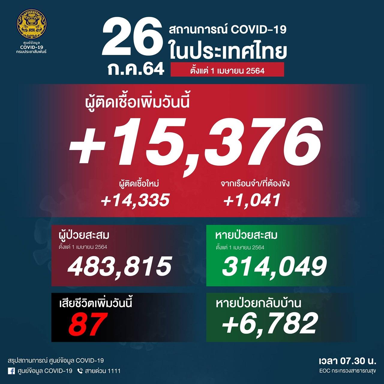 ผู้สื่อข่าวรายงานว่า กระทรวงสาธารณสุข ได้รายงานสถานการณ์โควิด-19 ประจำวันเบื้องต้น โดยข้อมูล ณ วันที่ 26 ก.ค. 2564 มีผู้ป่วยผู้ติดเชื้อรายใหม่ 15,376 ราย แยกเป็นทั่วไป 14,335 ราย และจากเรือนจำ/ที่ต้องขัง 1,041 ราย ทำให้มีผู้ป่วยสะสม (ตั้งแต่ 1 เม.ย. 2564) จำนวน 483,815 ราย และมีผู้เสียชีวิตเพิ่ม 87 ศพ.