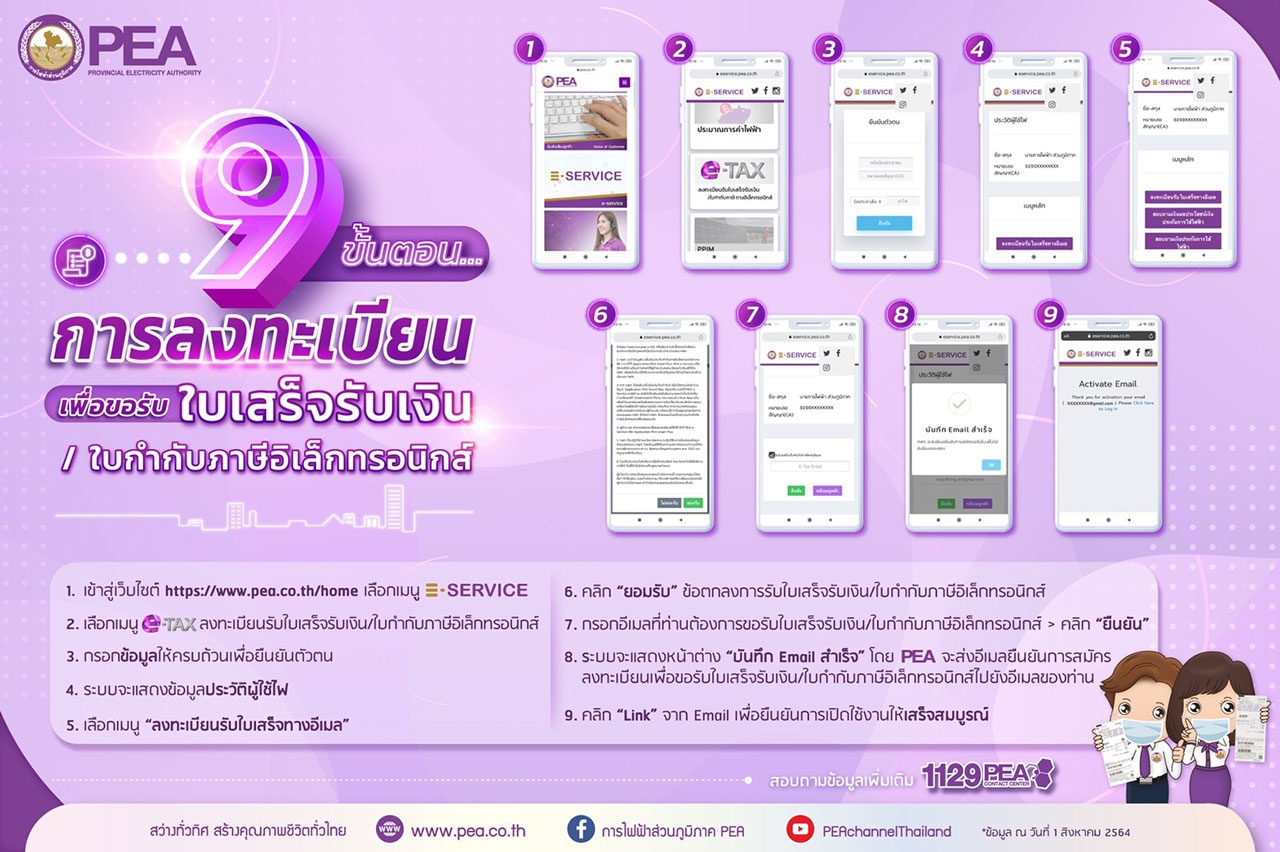 การไฟฟ้าส่วนภูมิภาค (PEA) ห่วงใยผู้ใช้ไฟฟ้าในสถานการณ์แพร่ระบาดเชื้อโควิด-19 แนะนำให้ผู้ใช้ไฟฟ้าลงทะเบียนเพื่อขอรับใบเสร็จรับเงิน /ใบกำกับภาษีอิเล็กทรอนิกส์ ผ่าน e-Service ทางช่องทาง ดังนี้