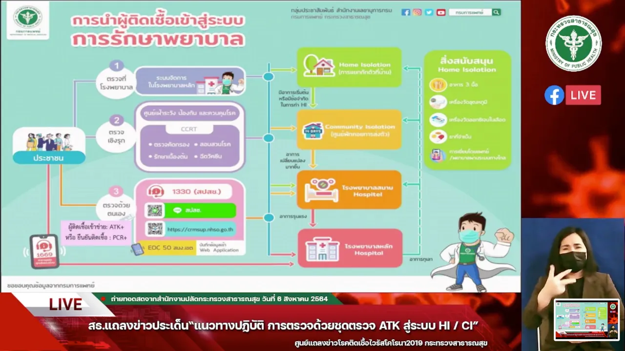 สาธารณสุข ยัน ใช้แนวทาง ตรวจATK (ผู้ติดเชื้อเข้าข่าย) พบผลเป็นบวกแล้วเข้าระบบรักษาได้ทันที หากเป็น คอมมูนิตี้ ไอโซเลชั่น ต้องตรวจ RT-PCR คู่ขนาน รับ ปรับแผนลดวันอยู่ รพ.ผู้ป่วย เหลือ 10 วัน เพื่อให้รับผู้ป่วยใหม่ได้มากขึ้น