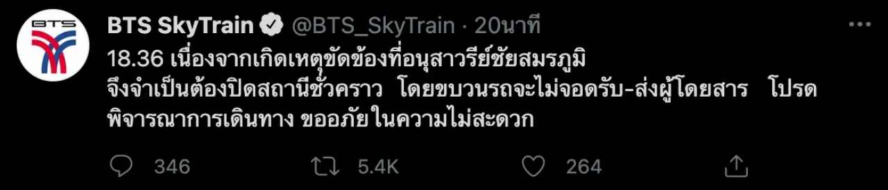 วันที่ 7 ส.ค. 2564 ทวิตเตอร์ BTS SkyTrain ระบุข้อความว่า "เวลา 18.36 น. เนื่องจากเกิดเหตุขัดข้องที่อนุสาวรีย์ชัยสมรภูมิ จึงจำเป็นต้องปิดสถานีชั่วคราว โดยขบวนรถจะไม่จอดรับ-ส่งผู้โดยสาร โปรดพิจารณาการเดินทาง ขออภัยในความไม่สะดวก".