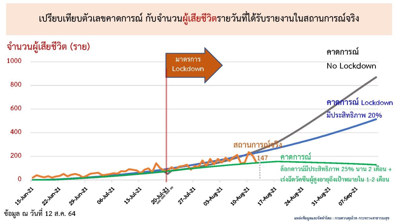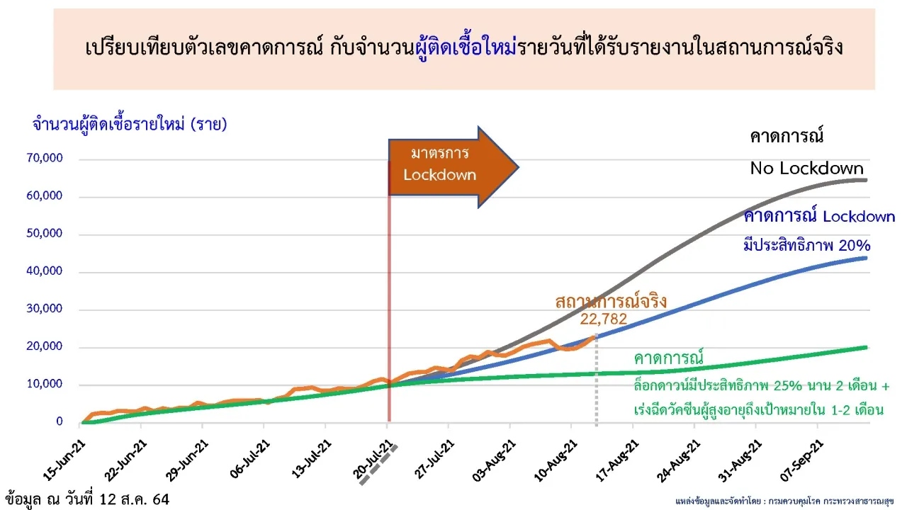 - กรณีไม่มีการล็อกดาวน์ อาจเกิดการติดเชื้อในช่วงปลาย ส.ค.-ต้น ก.ย. 2564 ถึง 60,000-70,000 รายต่อวัน