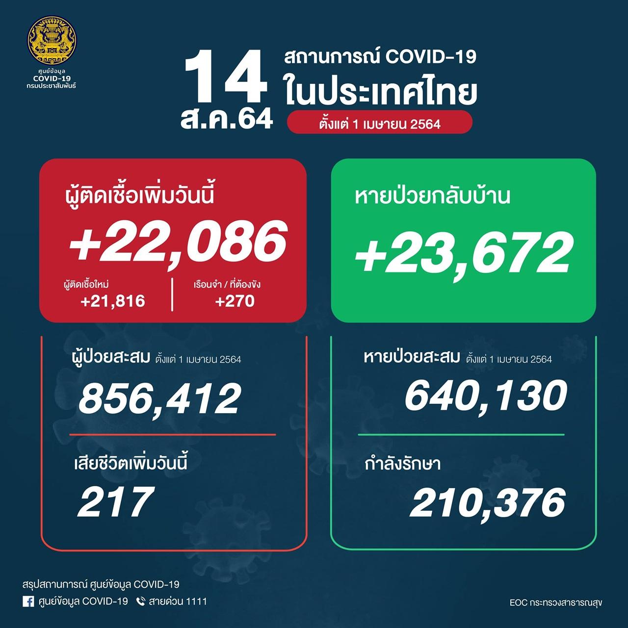 ผู้สื่อข่าวรายงานว่า กระทรวงสาธารณสุข ได้รายงานสถานการณ์โควิด-19 ประจำวันเบื้องต้น โดยข้อมูล ณ วันที่ 14 ส.ค. 2564 มีผู้ป่วยผู้ติดเชื้อรายใหม่ 22,086 ราย แยกเป็นทั่วไป 21,816 ราย และจากเรือนจำ/ที่ต้องขัง 270 ราย หายป่วยกลับบ้าน 23,672 ราย ทำให้มีผู้ป่วยสะสม (ตั้งแต่ 1 เม.ย. 2564) จำนวน 856,412 ราย และมีผู้เสียชีวิตเพิ่ม 217 ศพ.