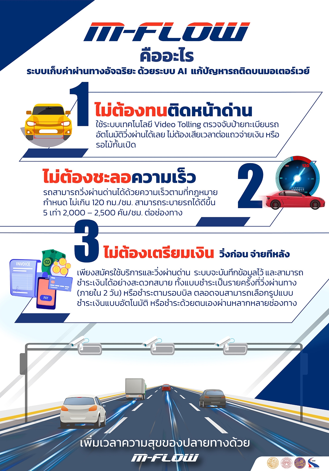 ในขณะเดียวกันก็จะยังคงมีบริการรับชำระเงินผ่านช่องของทางธนาคาร และ Counter Service ในรูปแบบต่างๆ ผ่าน QR Code ด้วยเพื่ออำนวยความสะดวกให้แก่ประชาชนและสร้างความมั่นใจในความปลอดภัยตลอดการเดินทางบนทางหลวงพิเศษระหว่างเมือง อย่างไรก็ตาม ผู้สนใจสมัครใช้บริการในช่วงทดสอบระบบเสมือนจริงแบบครบวงจร (Soft Opening) ระบบ M-Flow ในเดือนตุลาคม 64 โดยสามารถลงทะเบียนผ่านทางช่องทาง ดังนี้ 1. WebSite : www.mflowthai.com 2. Mobile Application : Mflow 3. จุดบริการที่กรมทางหลวงกำหนดทั้งนี้ สามารถติดตามข้อมูลและรายละเอียดการลงทะเบียนเพิ่มเติม ผ่านทาง Facebook : https://www.facebook.com/mflowthailand