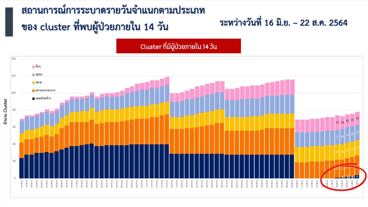 ทั้งนี้ กทม. มีการแสนอภาพสถานการณ์การระบาดจำแนกตามคลัสเตอร์ที่พบผู้ป่วยใน 14 วัน โดยเป็นข้อมูลระหว่างวันที่ 16 มิ.ย.-22 ส.ค. 2564 พบว่า “แคมป์ก่อสร้าง” เริ่มกลับมามีการติดเชื้ออีกครั้ง จึงเกิดความกังวลและ กทม.ต้องเรียนรู้ในบทเรียนที่เคยเจอมาก่อนหน้านี้ จะมีวิธีการควบคุม ป้องกันการระบาดในแคมป์ หรือพื้นที่เดิมๆ อย่างไร เนื่องจาก ตลาด โรงงาน แคมป์ก่อสร้าง เป็นสถานที่ที่มักจะมีการติดเชื้ออยู่เรื่อยๆ จนไปถึงระดับครอบครัว โดย กทม.ต้องปรับแผนเพื่อเร่งตรวจหาผู้ติดเชื้อเชิงรุกให้มากขึ้น